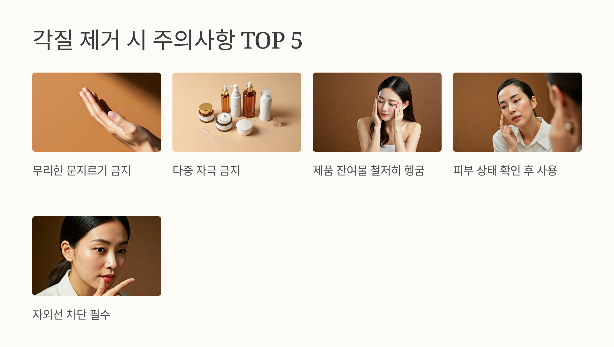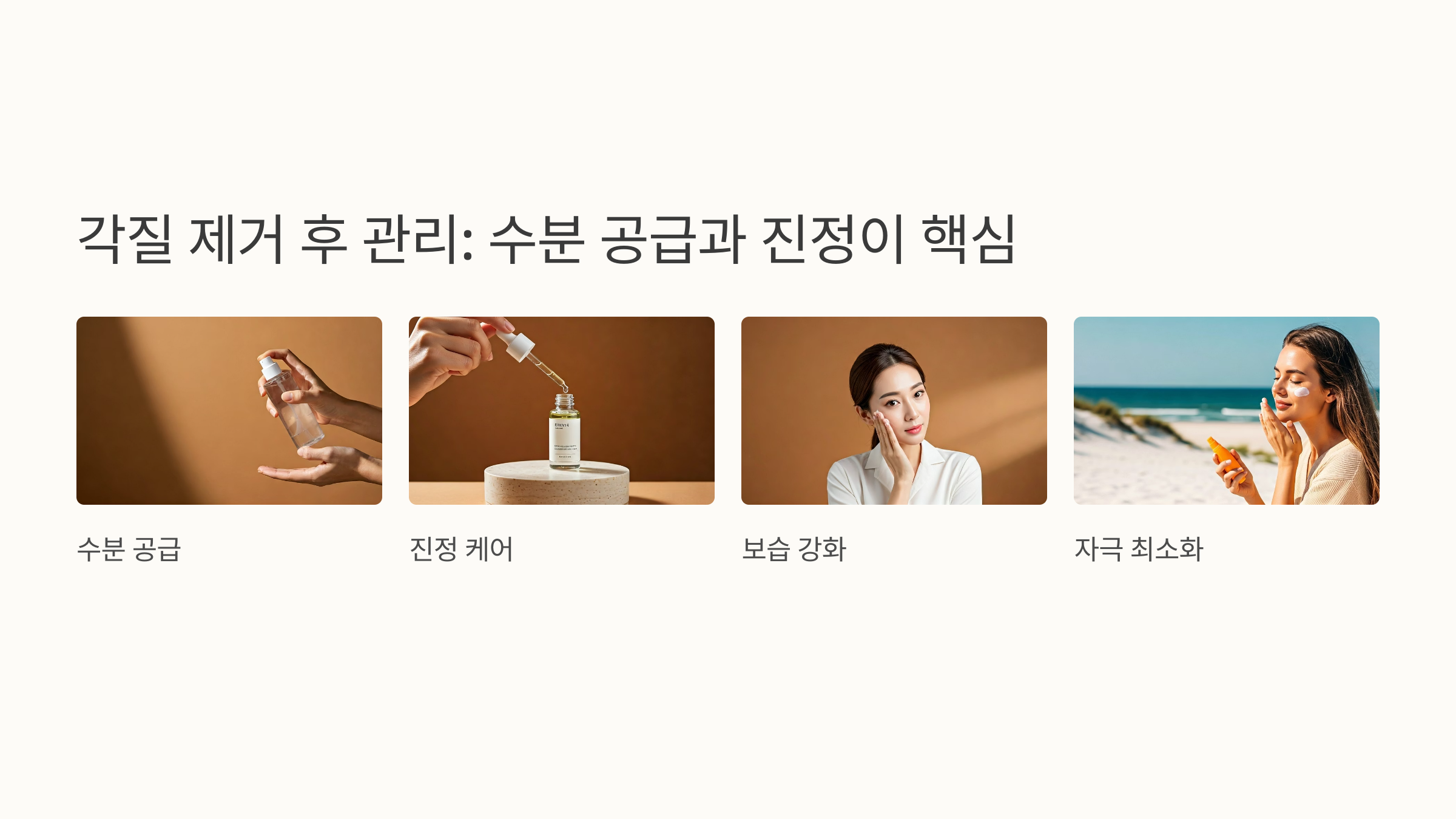 추가로, 각질 제거 후 2~3일간은 햇빛 노출 최소화, 화장품 성분 확인, 자극적인 제품 피하기 등을 통해 피부 회복 시간을 충분히 주는 것이 중요합니다.