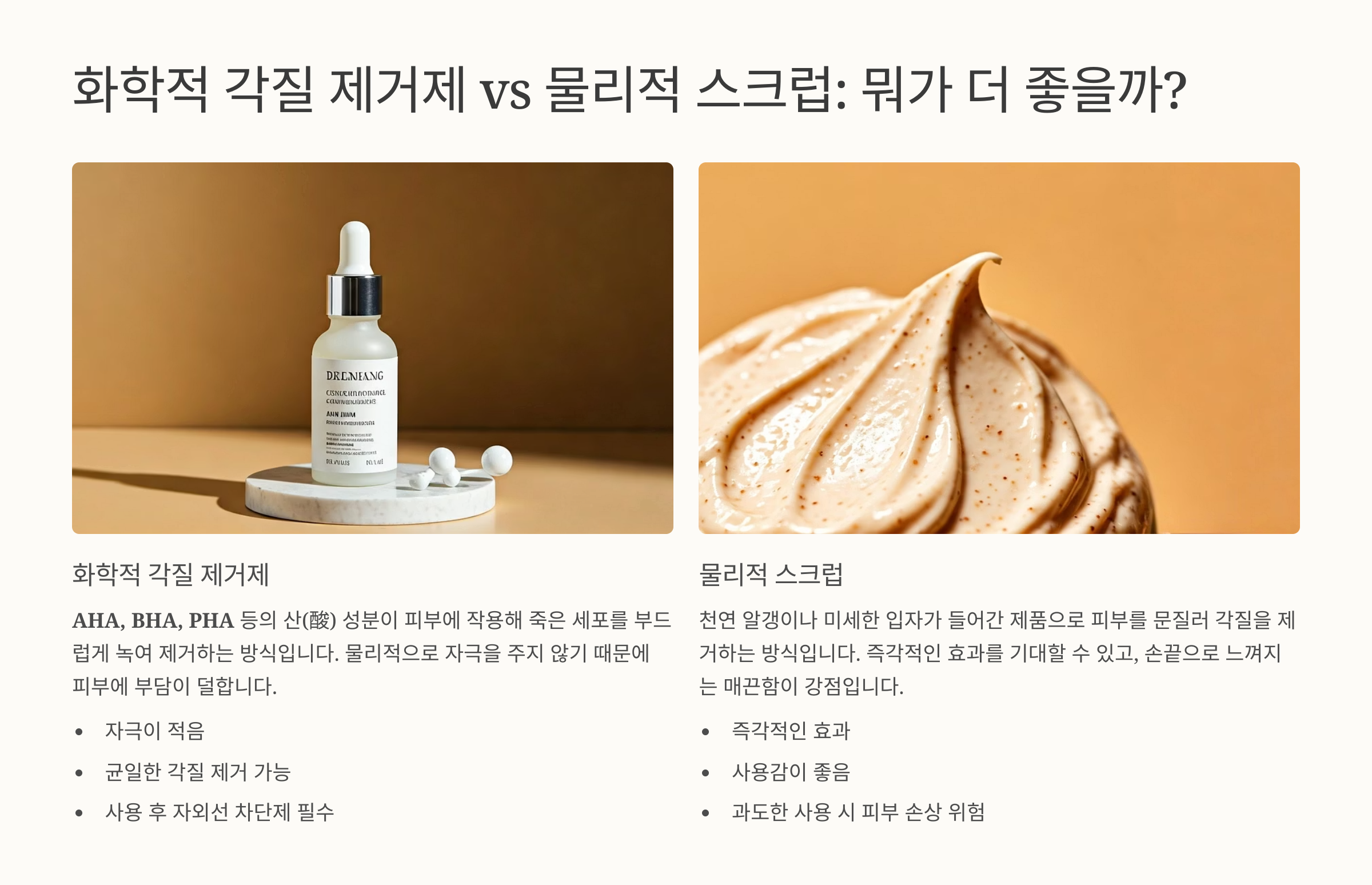각질 제거 제품은 크게 화학적 필링제와 물리적 스크럽으로 나뉩니다. 이 두 가지 방식은 접근 방식이 다르며, 장단점도 명확히 구분됩니다.