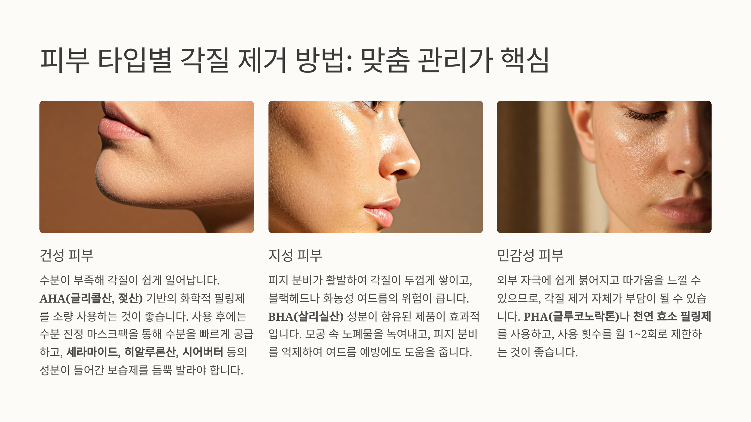 피부 타입에 따라 각질 제거 방법은 완전히 달라져야 합니다. 잘못된 방법은 피부에 자극을 주고 트러블을 유발할 수 있으므로, 반드시 자신의 피부 타입을 정확히 파악하고 그에 맞는 전략을 세워야 합니다.