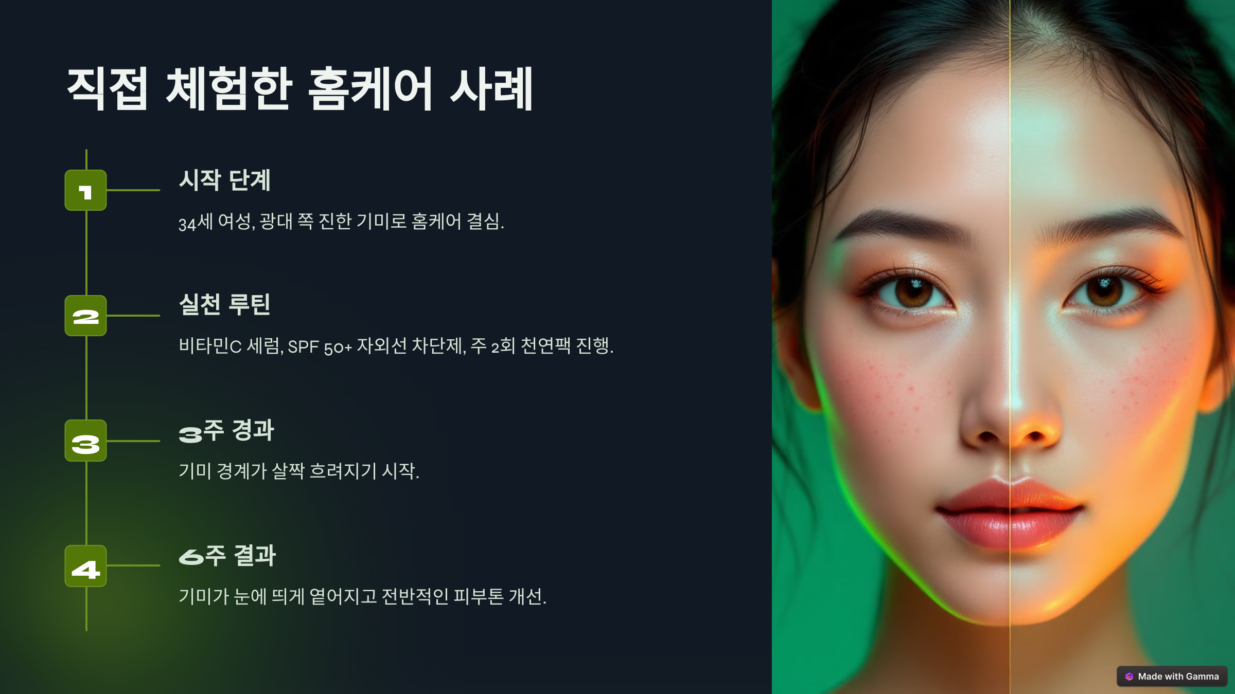 “작년 여름, 광대 쪽에 진하게 자리 잡은 기미가 너무 신경 쓰였어요. 피부과 시술은 비용 부담도 있고, 시술 후 회복 시간도 걱정되더라고요. 그래서 홈케어로 꾸준히 개선해 보기로 결심했죠.”