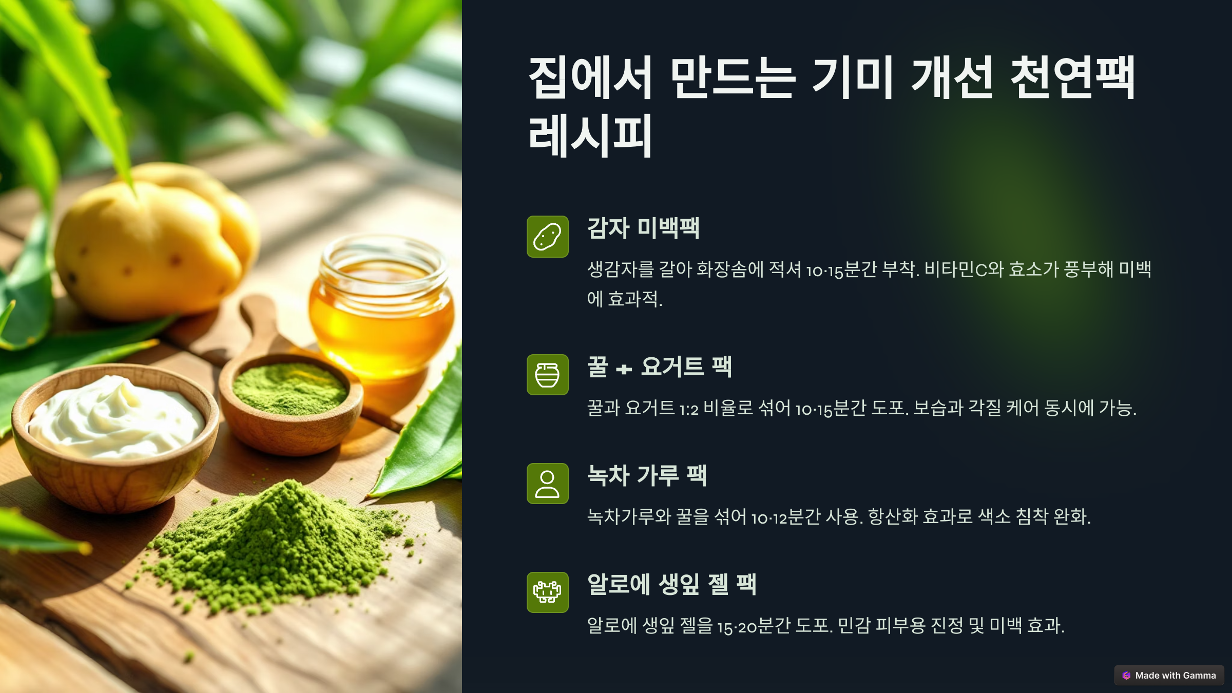- 감자는 비타민C와 효소가 풍부해 미백에 효과적이지만, 생감자 성분에 민감할 수 있으니 처음엔 소량 테스트 후 사용하세요.