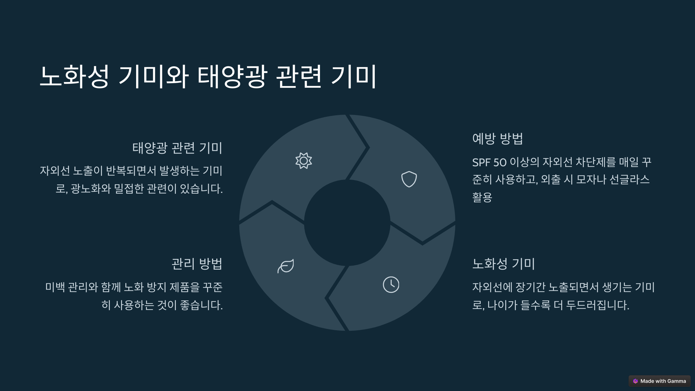 노화성 기미는 '시간을 되돌릴 수는 없지만, 속도를 늦출 수는 있다'는 마인드로 접근하는 것이 핵심입니다.