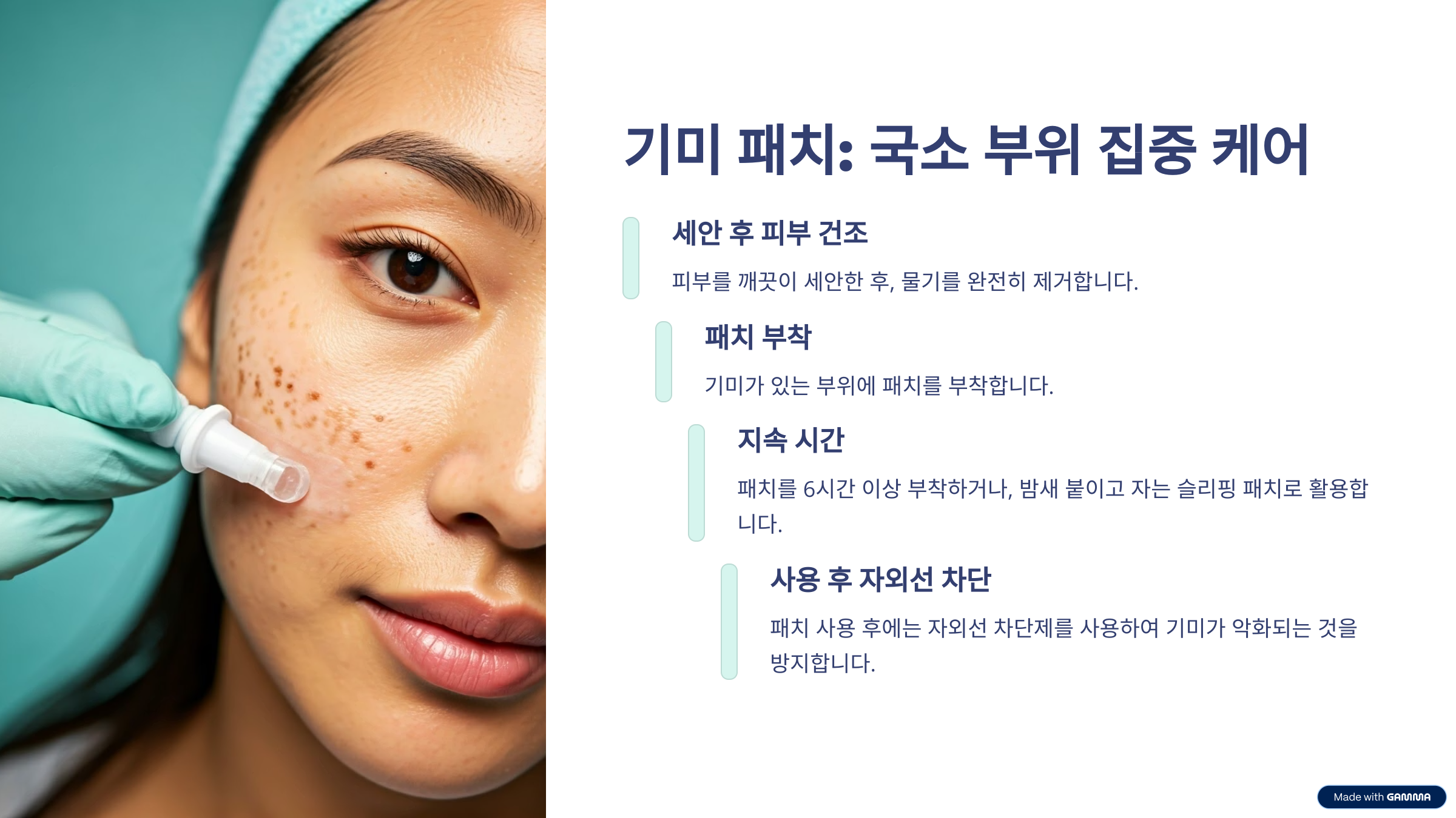 - 패치 부착: 기미가 있는 부위에 패치를 부착합니다.