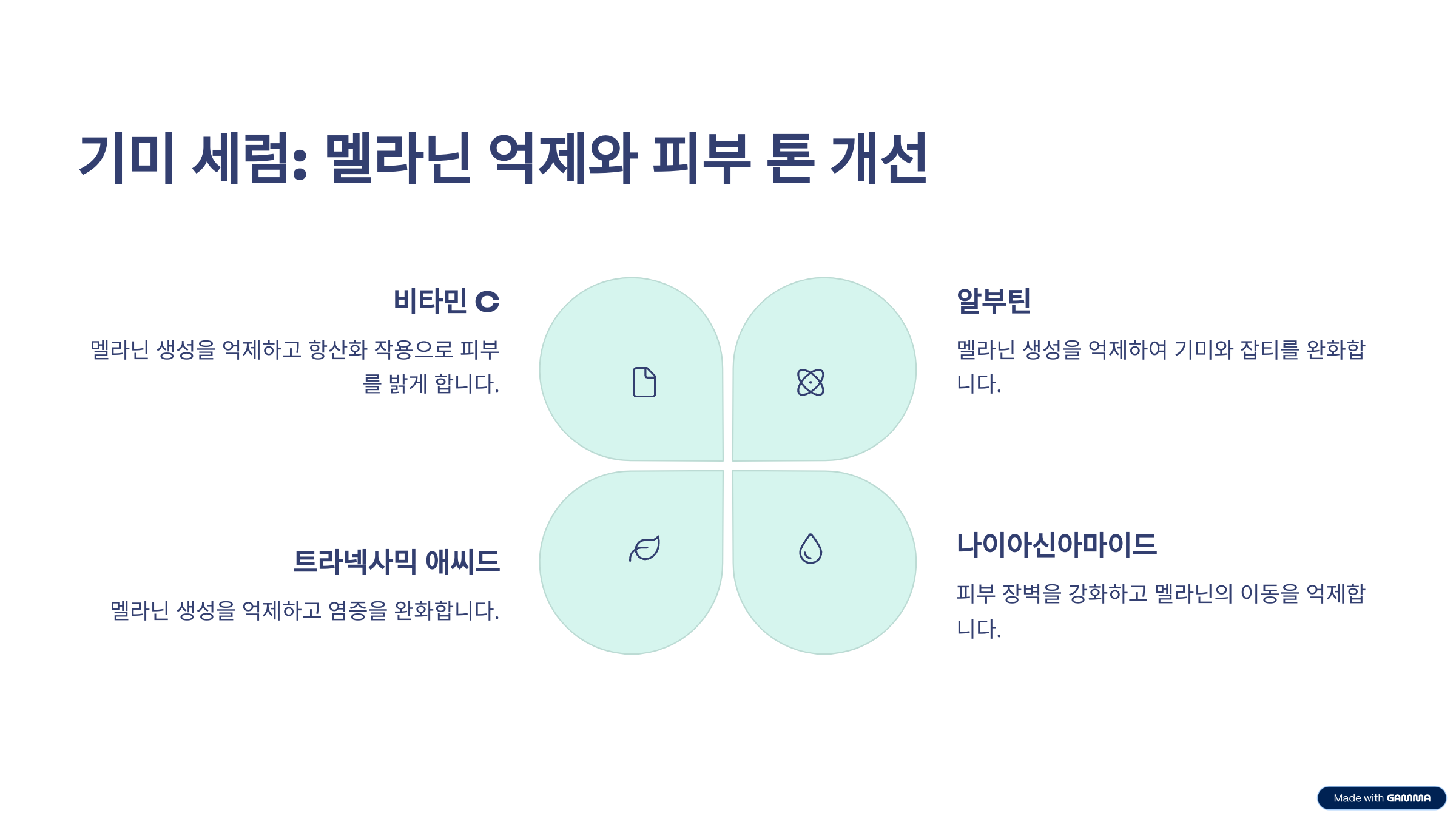 기미 세럼은 멜라닌 생성을 억제하고 이미 형성된 색소를 분해하여 피부 톤을 개선하는 데 도움을 줍니다. 주요 성분으로는: