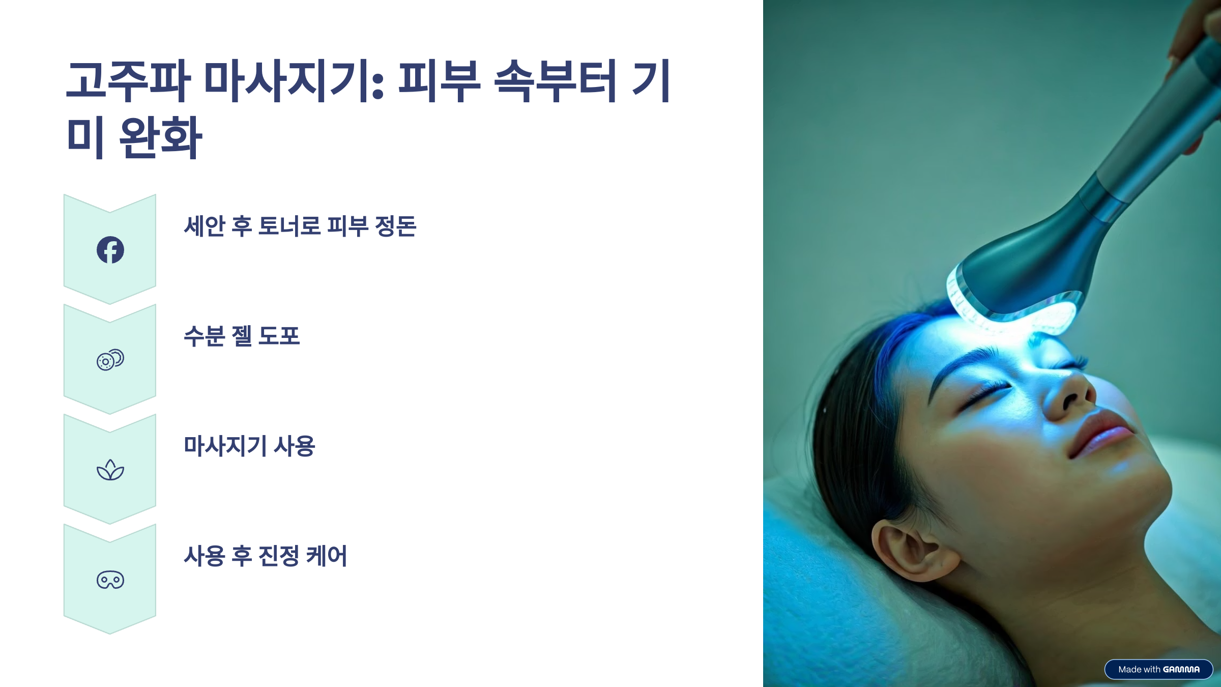 5분 정도 사용하며, 주 23회 꾸준히 반복하면 좋습니다. - 사용 후 진정 케어: 마사지 후에는 진정 효과가 있는 마스크팩이나 크림을 사용하여 피부를 진정시킵니다.