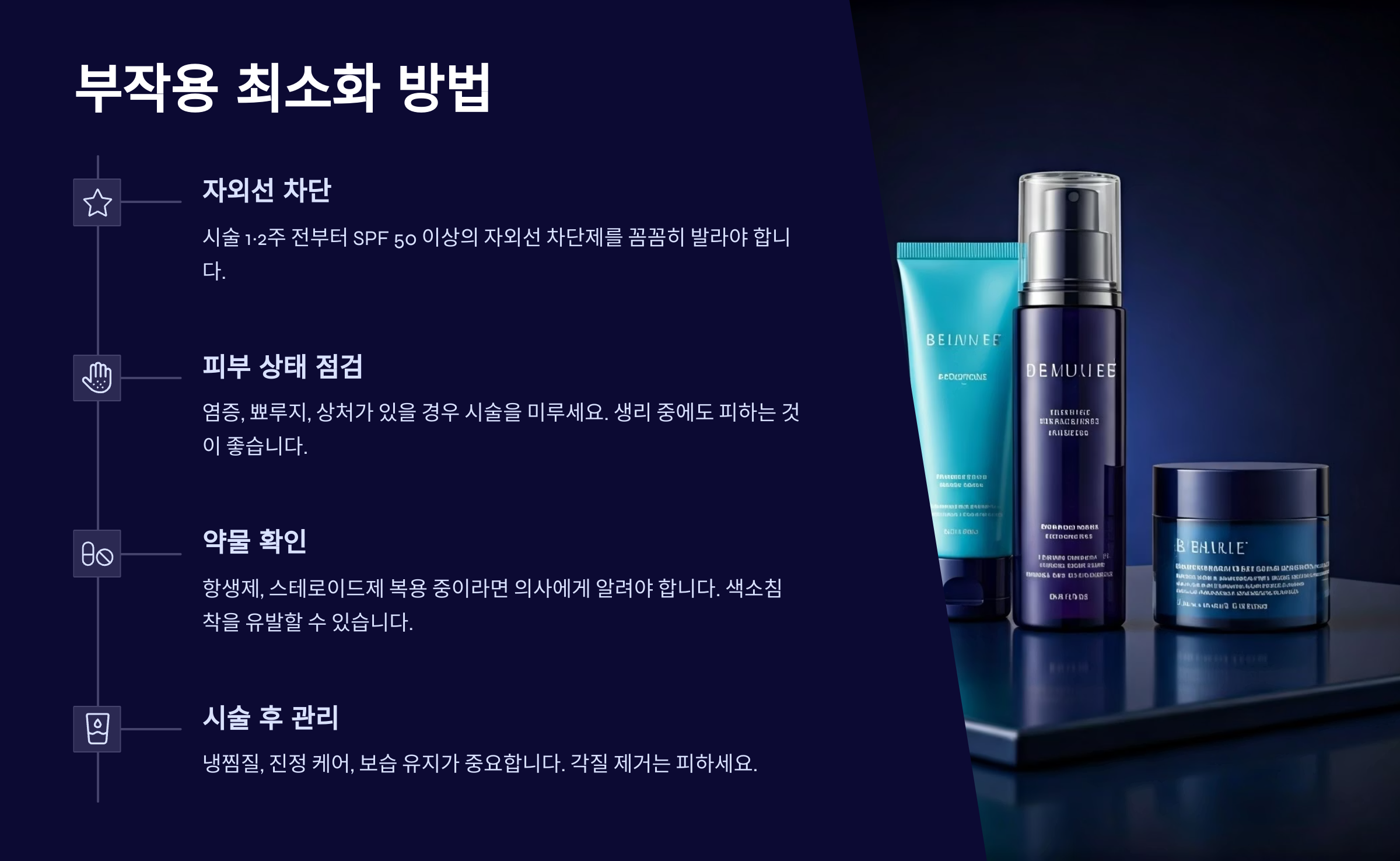 - 자외선 차단: 시술 전후 가장 중요한 것은 자외선 차단입니다. 시술 1~2주 전부터 SPF 50 이상의 자외선 차단제를 꼼꼼히 발라야 하며, 시술 후에는 더욱 철저한 차단이 필요합니다.