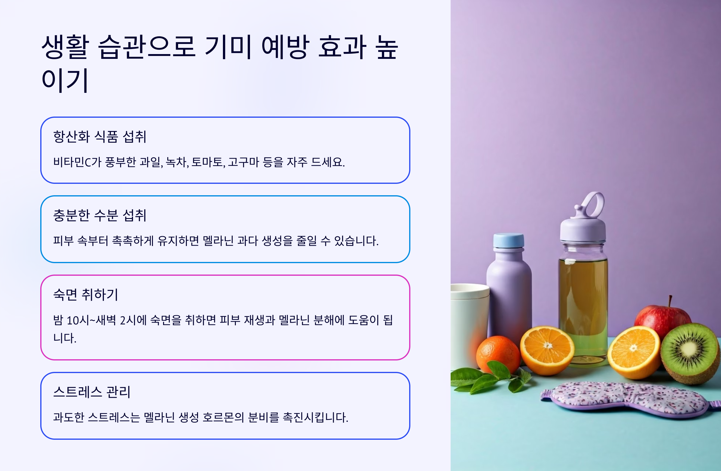 피부는 외부 관리만으로는 완벽하게 보호하기 어렵습니다. 따라서 기미 없는 피부를 위해서는 식습관과 수면 습관, 스트레스 관리 등 전반적인 생활 습관까지 함께 점검하는 것이 좋습니다.