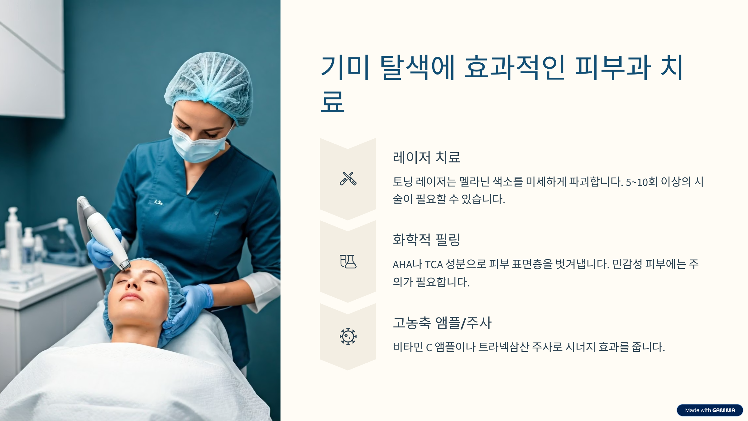 또 다른 방법으로는 화학적 필링이 있습니다. AHA나 TCA 같은 성분을 이용해 피부의 표면층을 벗겨내며 색소를 연하게 합니다. 하지만 이 또한 피부 자극이 동반될 수 있으므로 민감성 피부에는 주의가 필요합니다. 최근에는 비타민 C 고농축 앰플이나 트라넥삼산 주사를 병행해 시너지 효과를 주기도 합니다. 이처럼 피부과 치료는 과학적으로 효과가 입증된 방법이지만, 꾸준함과 적절한 사후관리가 병행되어야 안정적인 결과를 얻을 수 있습니다.