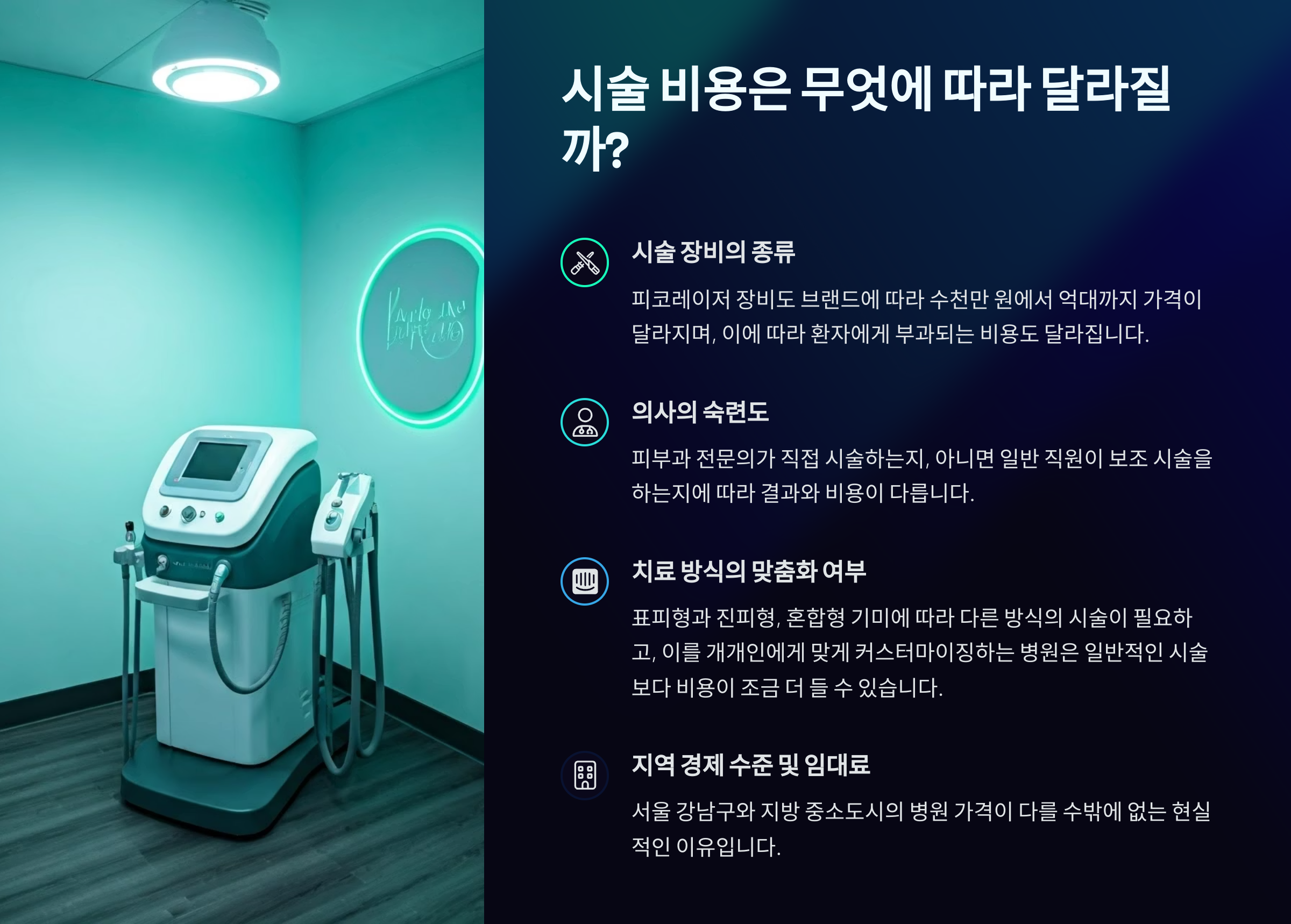 - 시술 장비의 종류: 예를 들어, 피코레이저 장비도 브랜드에 따라 수천만 원에서 억대까지 가격이 달라지며, 이에 따라 환자에게 부과되는 비용도 달라집니다.