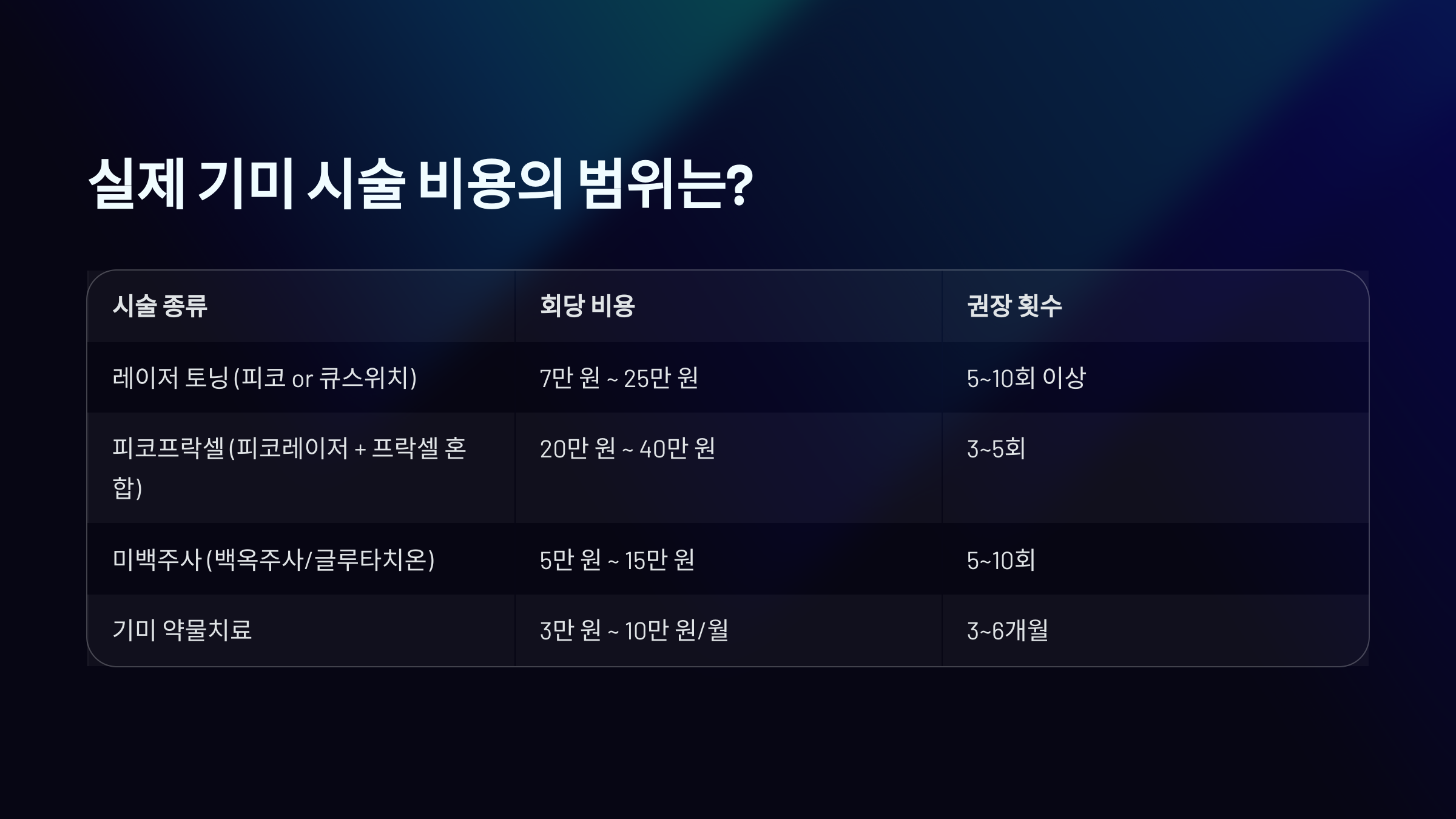 많은 사람들이 궁금해하는 것이 바로 '기미 시술은 실제로 얼마나 드는가?' 입니다. 피부과에서 제공하는 기미 관련 시술은 매우 다양하며, 시술 종류와 횟수에 따라 전체 비용은 크게 차이가 납니다. 대표적인 시술과 평균 비용은 다음과 같습니다.