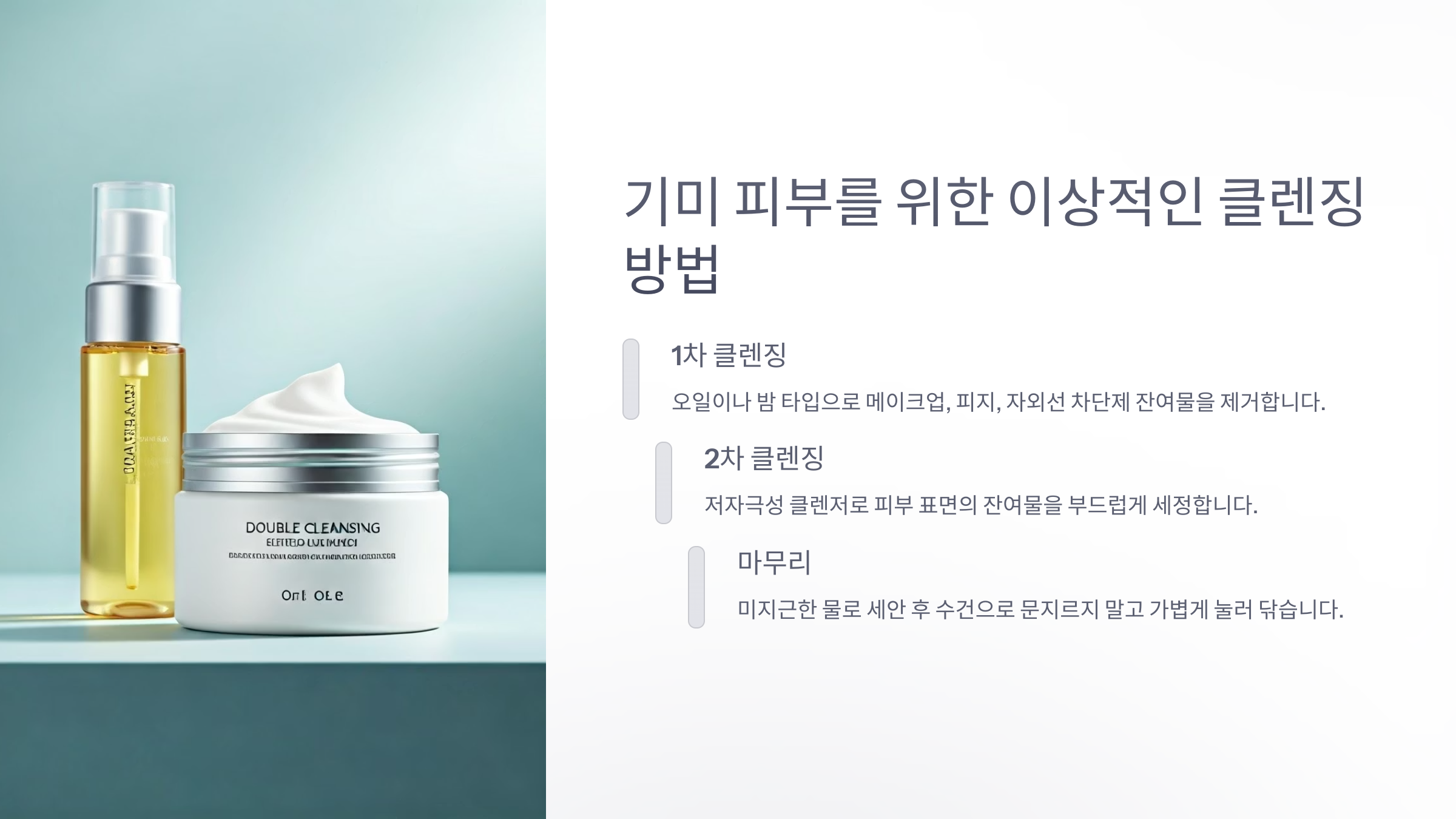 기미는 단순한 색소 침착이 아닌, 피부 깊숙한 층에서 발생하는 복합적인 색소 문제입니다. 따라서 기미를 효과적으로 관리하기 위해서는 단순히 겉으로 드러난 얼룩만을 제거하는 것이 아니라, 피부 깊숙한 곳까지 고려한 관리가 필요합니다. 그 첫걸음이 바로 '클렌징'입니다. 클렌징은 하루 동안 쌓인 노폐물, 먼지, 메이크업 잔여물 등을 제거하여 피부가 제대로 숨 쉴 수 있도록 돕는 과정입니다. 기미 피부의 경우, 잘못된 클렌징으로 인해 자극이 가중되거나 피부 장벽이 약해질 경우 기미가 더욱 악화될 수 있기 때문에, 세심하고 적절한 클렌징이 필수적입니다. 자극 없이 부드럽게, 그러나 충분히 깨끗하게 세정하는 것이 기미 피부 관리의 핵심입니다.