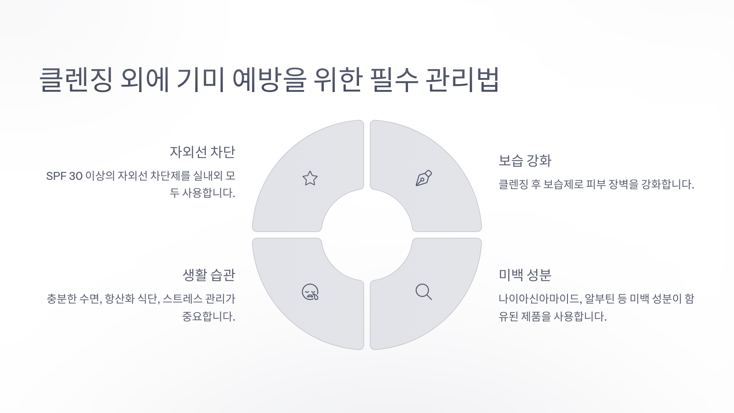 클렌징만으로는 기미를 완벽히 막을 수 없습니다. 클렌징 후에는 반드시 보습제를 발라 피부 장벽을 강화해 주고, 아침에는 자외선 차단제를 꼼꼼히 발라야 합니다. 자외선은 기미를 유발하고 악화시키는 주범이기 때문에, 실내외를 막론하고 SPF 30 이상의 자외선 차단제를 사용하는 것이 중요합니다. 또한, 미백 성분(나이아신아마이드, 알부틴 등)이 함유된 에센스나 크림을 활용하여 기미 개선을 병행하는 것도 좋은 방법입니다. 생활 습관 역시 매우 중요합니다. 충분한 수면, 항산화 식단(비타민 C, E가 풍부한 식품 섭취), 스트레스 관리 등을 통해 몸속부터 피부 건강을 챙겨야 기미 예방에 효과적입니다. 이 모든 관리는 꾸준함이 관건이며, 눈에 띄는 변화를 위해 최소 3~6개월 이상의 지속적인 관리가 필요합니다.
