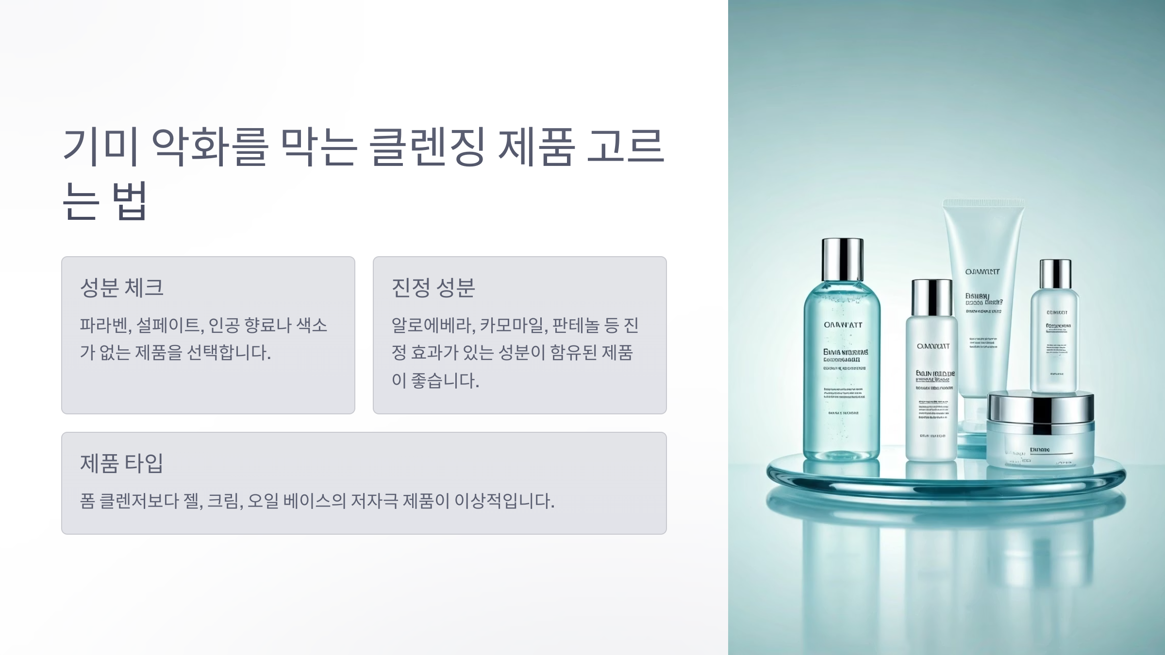 기미 피부를 위한 클렌징 제품을 선택할 때 가장 중요한 기준은 '저자극'과 '보습 유지'입니다. 성분을 꼼꼼히 살펴, 파라벤, 설페이트(SLS, SLES), 인공 향료나 색소 등이 포함되지 않은 제품을 고르는 것이 좋습니다. 또한 천연 유래 성분이나 진정 성분(예: 알로에베라, 카모마일, 판테놀 등)이 포함된 제품은 피부 자극을 최소화하고 진정 효과를 기대할 수 있습니다. 클렌저의 타입 또한 중요합니다. 거품이 풍성한 폼 클렌저보다는 젤 타입, 크림 타입, 또는 오일 베이스의 저자극 제품을 선택하는 것이 이상적입니다. 특히 민감성 기미 피부는 pH 균형이 맞는 약산성 클렌저를 선택해 피부 장벽을 보호해야 합니다.