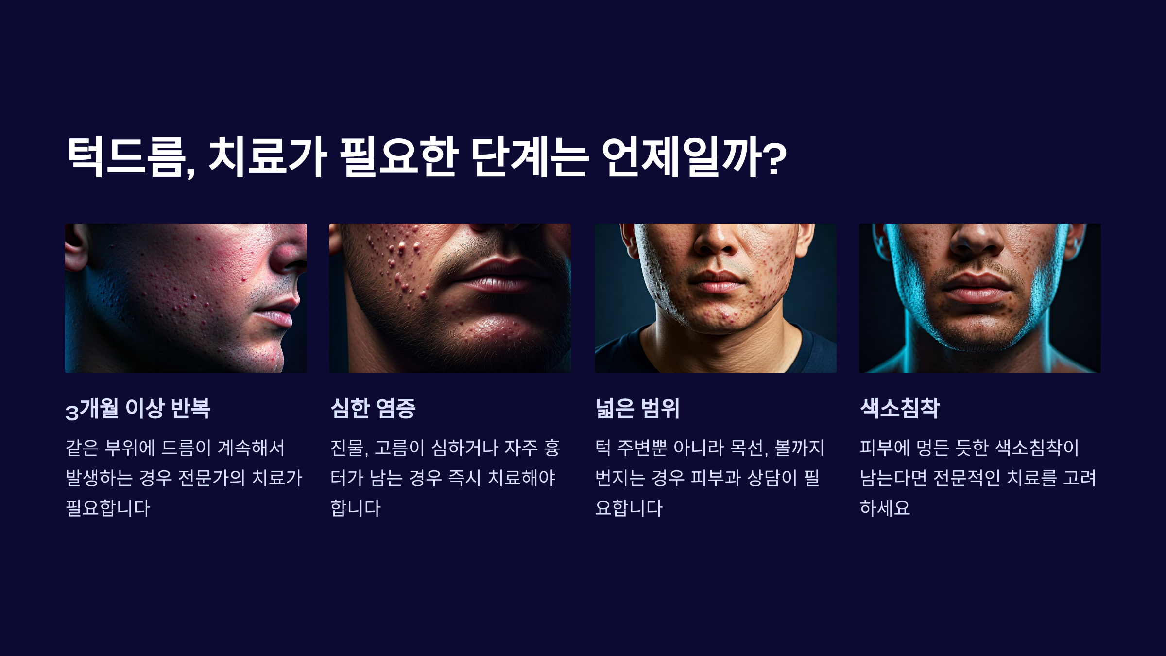이처럼 턱드름은 단순히 “피부에 뭔가 났다”는 수준이 아니라 단계별로 전혀 다른 접근이 필요한 피부 질환입니다. 자신이 현재 어떤 상태에 있는지 파악한 뒤 적절한 제품과 루틴을 적용해야 합니다.