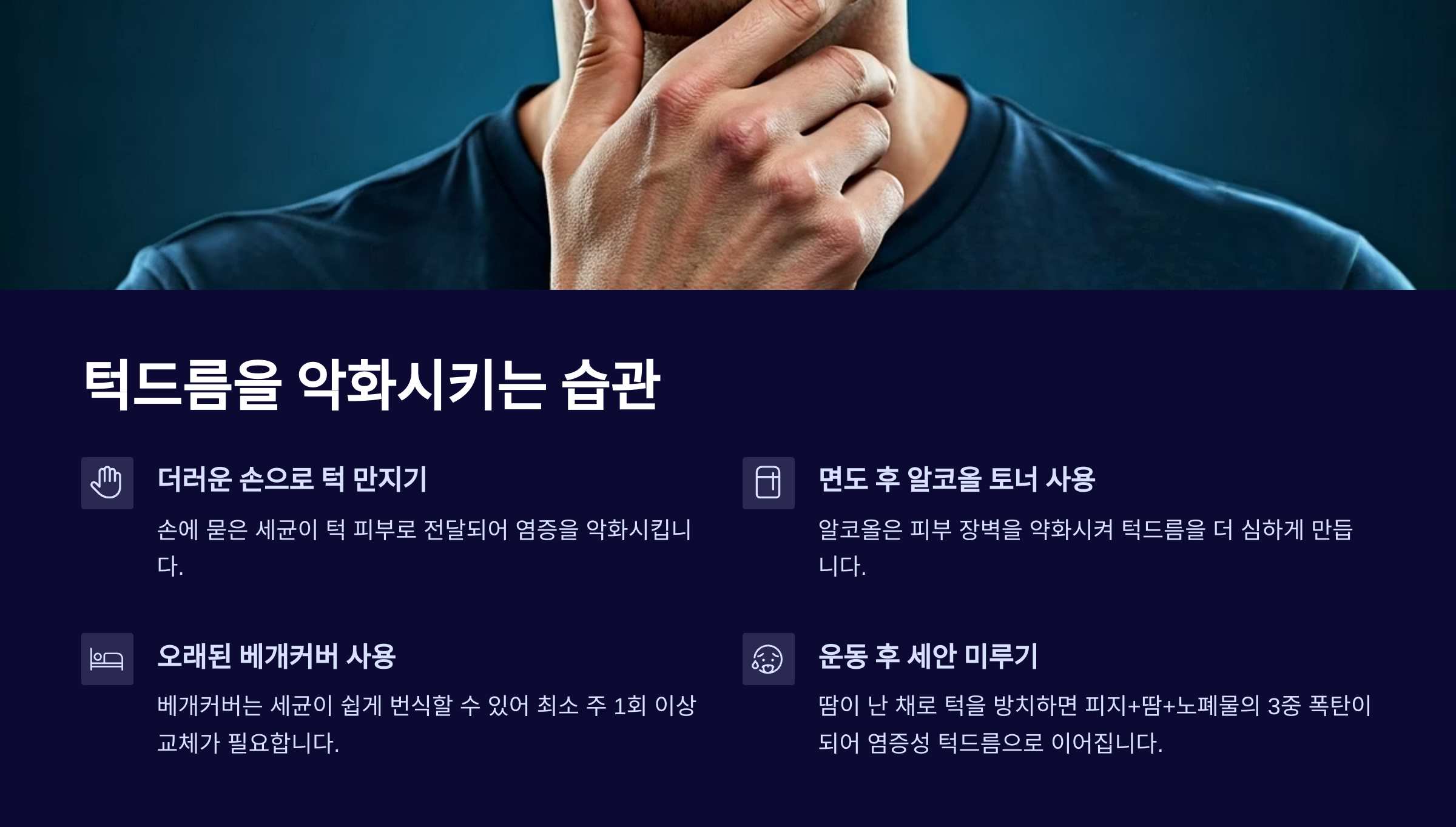 특히 베개커버나 수건은 세균이 쉽게 번식할 수 있는 환경이기 때문에, 최소 주 1회 이상 교체가 필요합니다. 또한 운동 후 땀이 난 채로 턱을 방치하면 피지+땀+노폐물의 3중 폭탄이 되어 염증성 턱드름으로 이어집니다.