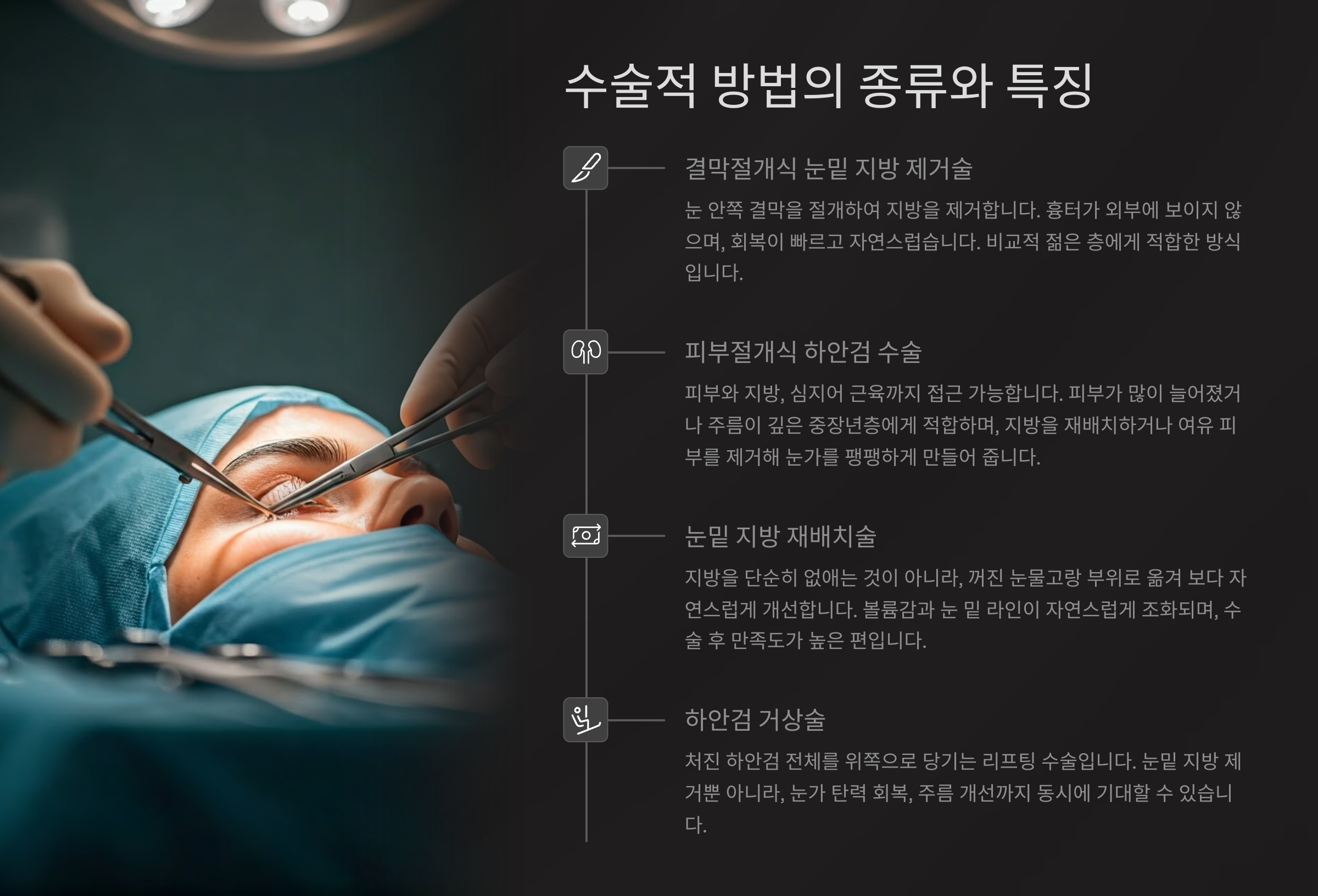 - 피부절개식 하안검 성형과 지방 재배치를 병행하는 것이 효과적입니다.