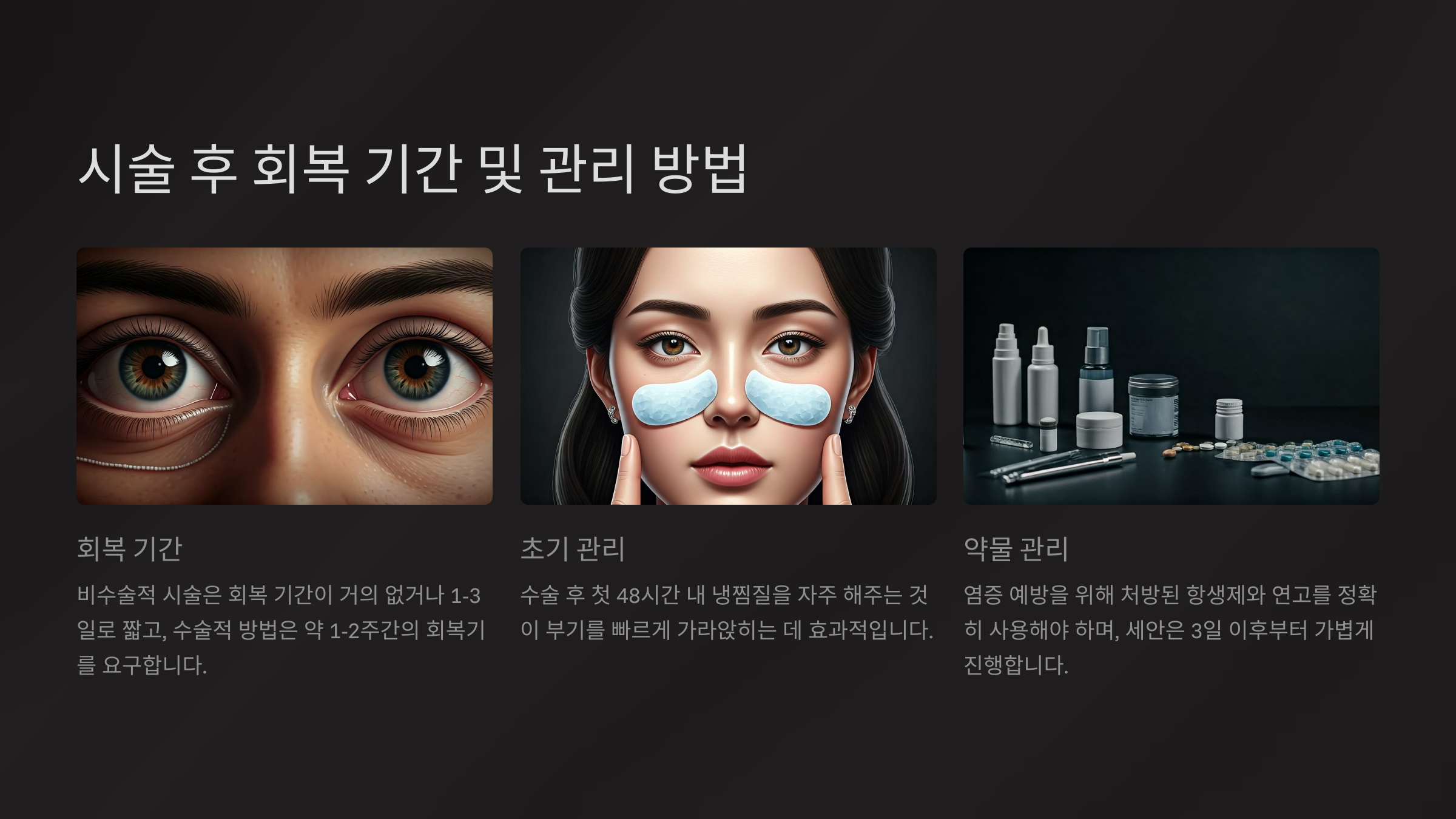 - 염증 예방을 위해 처방된 항생제와 연고를 정확히 사용해야 하며, 세안은 3일 이후부터 가볍게 진행합니다.