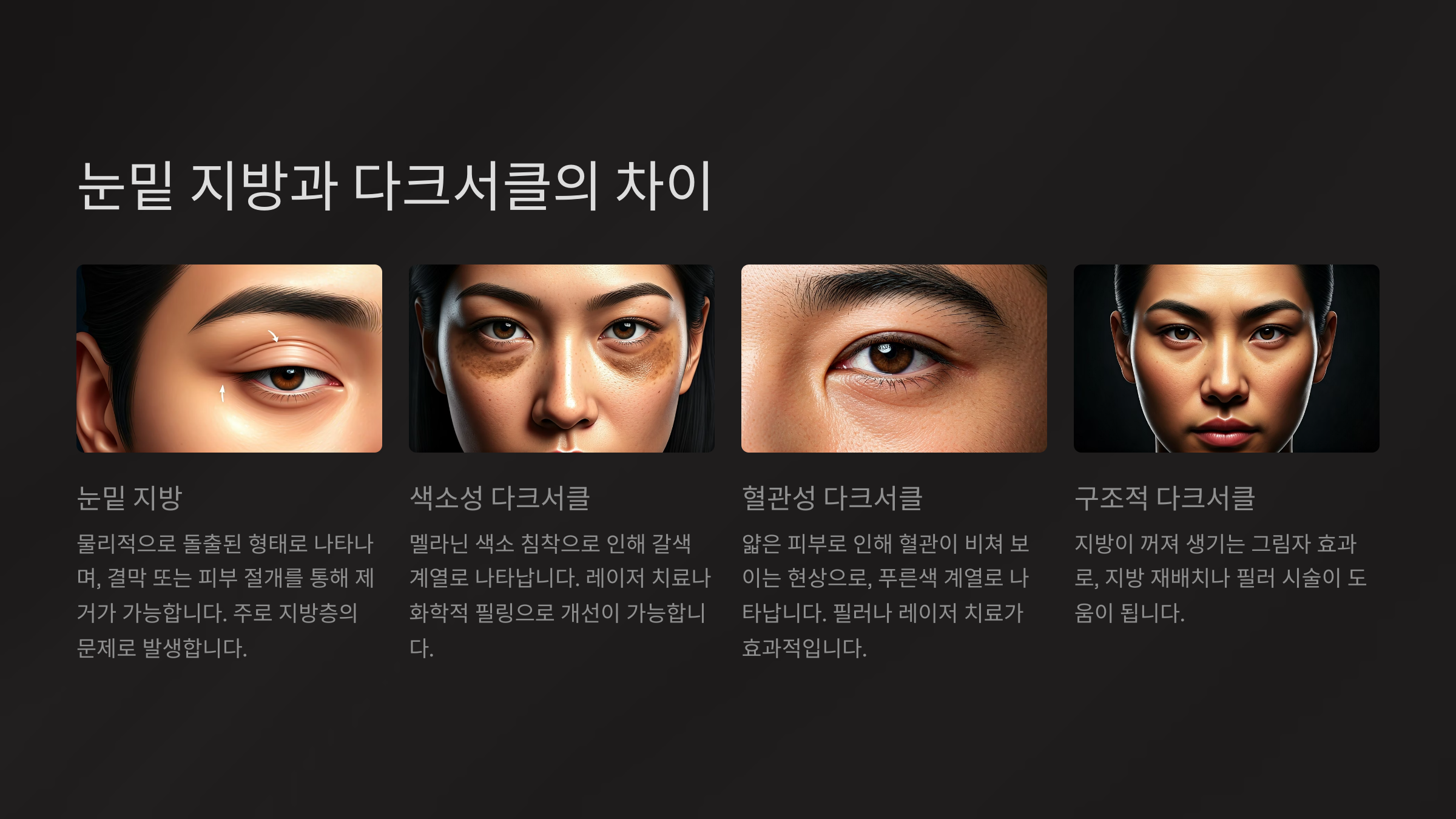 - 다크서클: 색소 침착(갈색), 혈관 비침(푸른색), 지방 꺼짐(그림자)