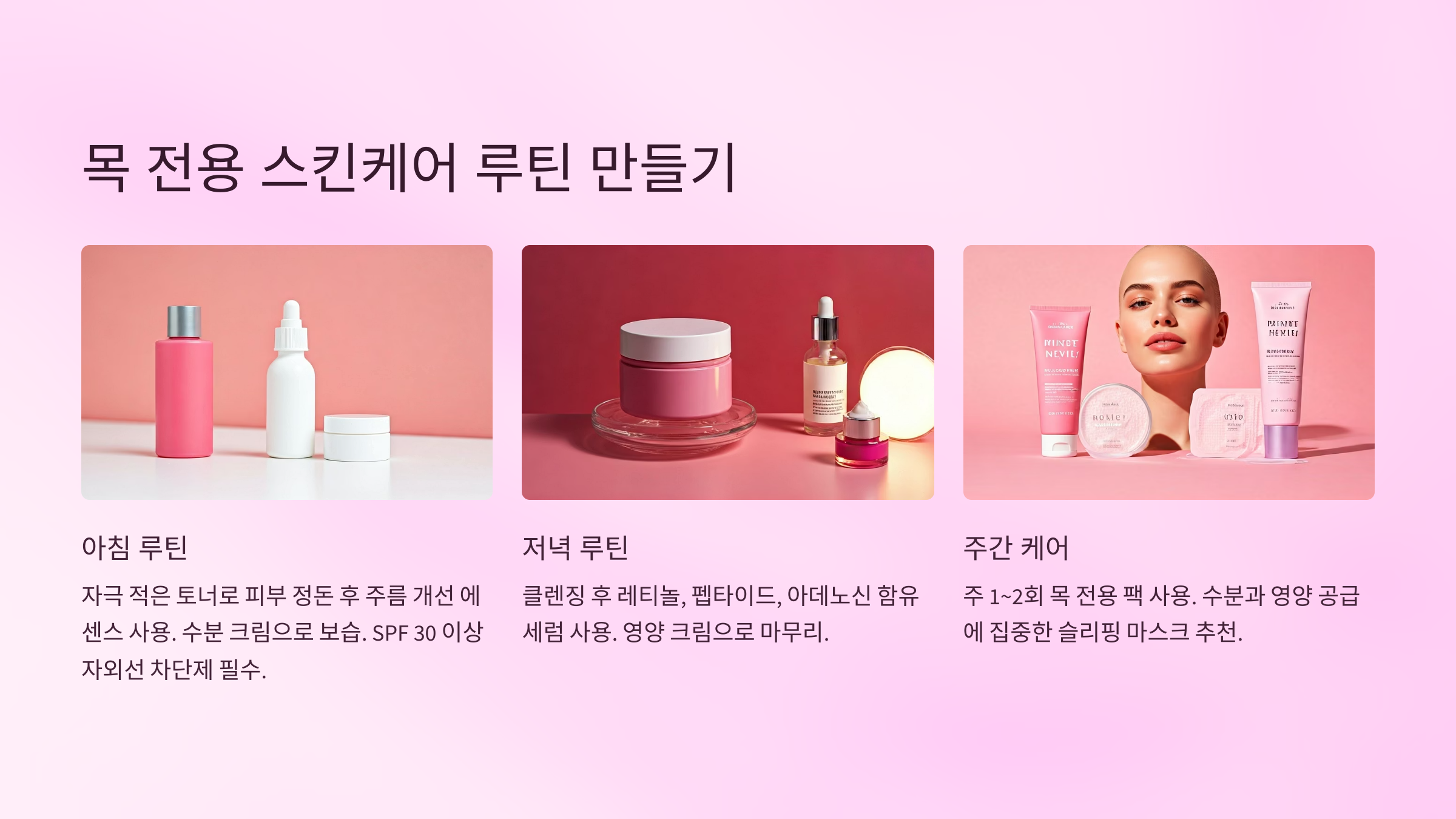 저녁에는 클렌징 단계부터 신경 써야 합니다. 목에 쌓인 노폐물이나 땀, 먼지 등을 깨끗하게 닦아낸 뒤, 재생 성분이 포함된 세럼이나 앰플을 사용하면 좋습니다. 특히 레티놀, 펩타이드, 아데노신, 나이아신아마이드 같은 주름 개선 성분은 목 피부에 탄력과 광채를 부여하는 데 효과적입니다.