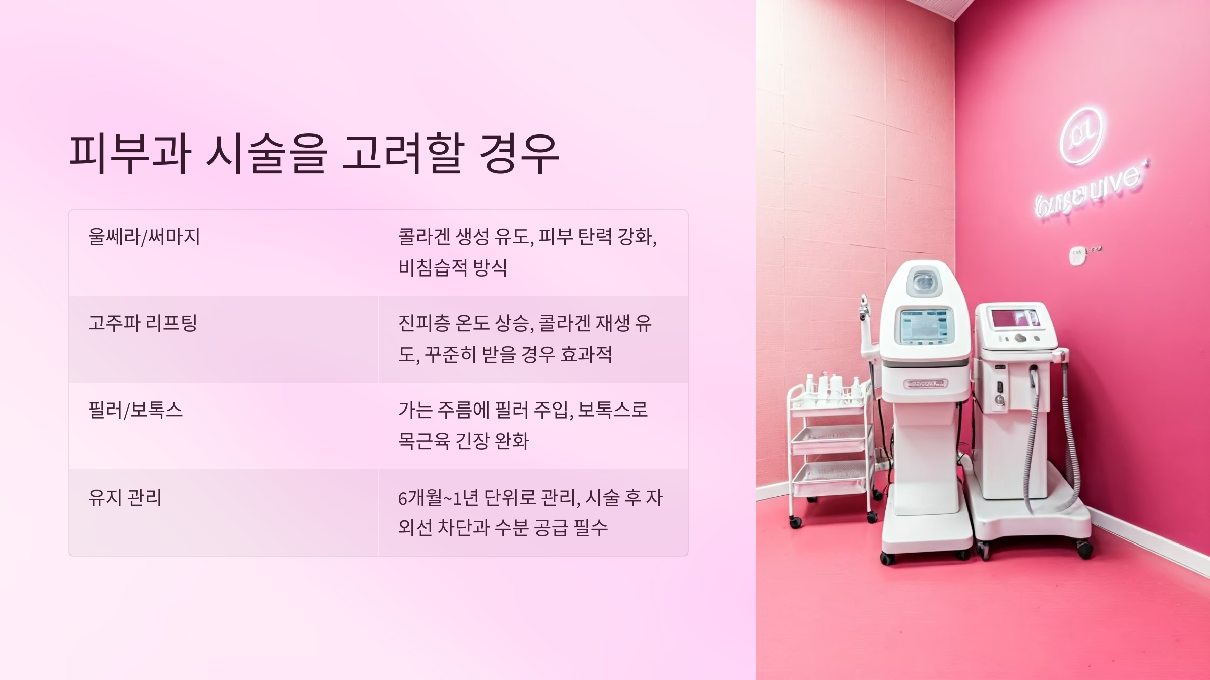 목주름이 이미 깊어졌거나 홈케어만으로는 만족할 수 없다면, 전문적인 피부과 시술을 고려할 수 있습니다. 대표적인 시술에는 울쎄라, 써마지, HIFU(고강도 집중 초음파), 고주파 리프팅(RF), 실리프팅, 필러, 보톡스 등이 있으며, 각각의 특징과 효과를 잘 이해하고 선택하는 것이 중요합니다.