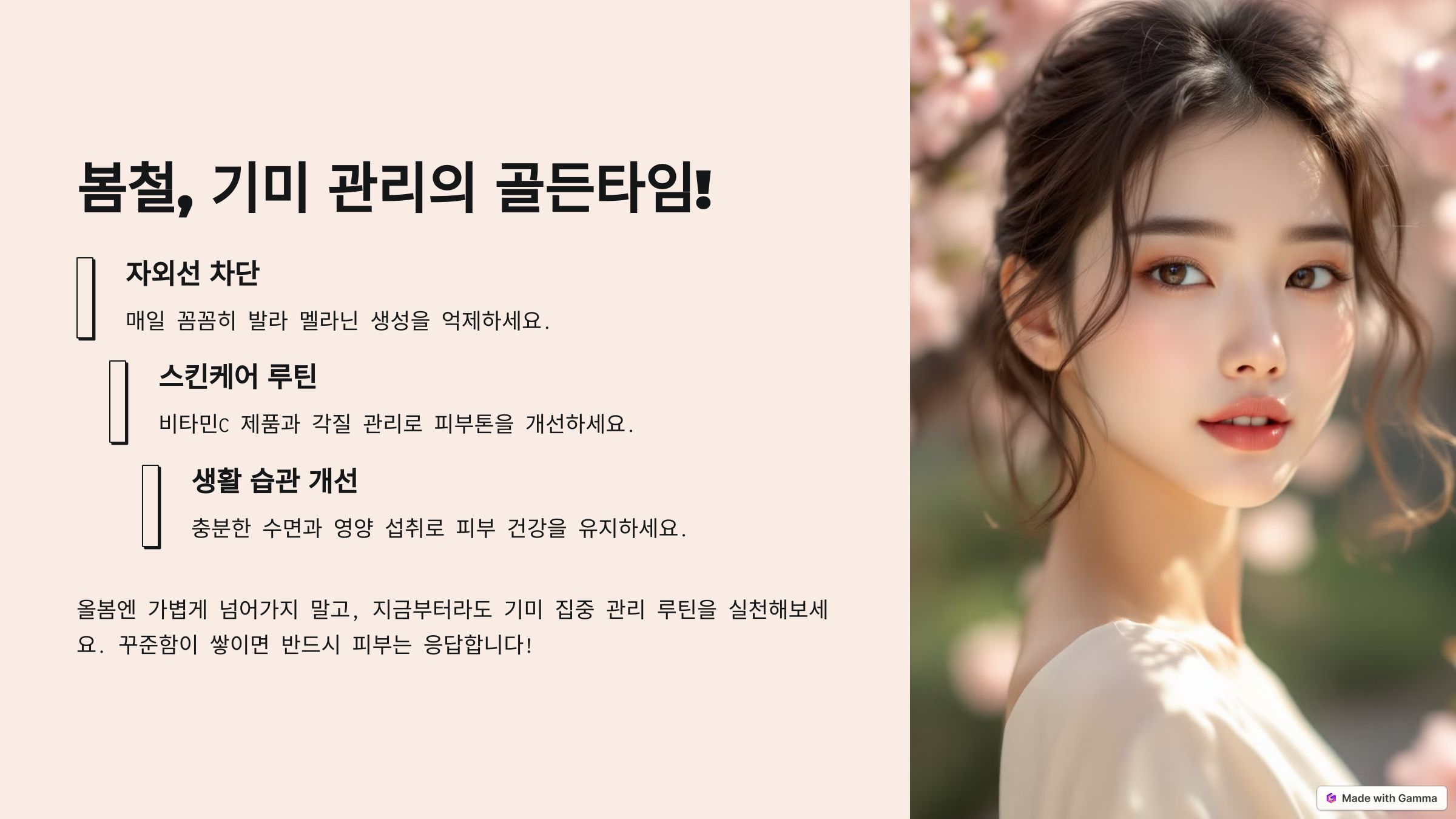 봄은 기미가 생기기 쉬운 계절이지만, 동시에 기미 예방과 관리에 있어 가장 중요한 시기이기도 합니다. 자외선 차단부터 스킨케어 루틴, 생활 습관까지 조금만 더 신경 쓴다면 여름에도 맑고 깨끗한 피부를 유지할 수 있습니다..