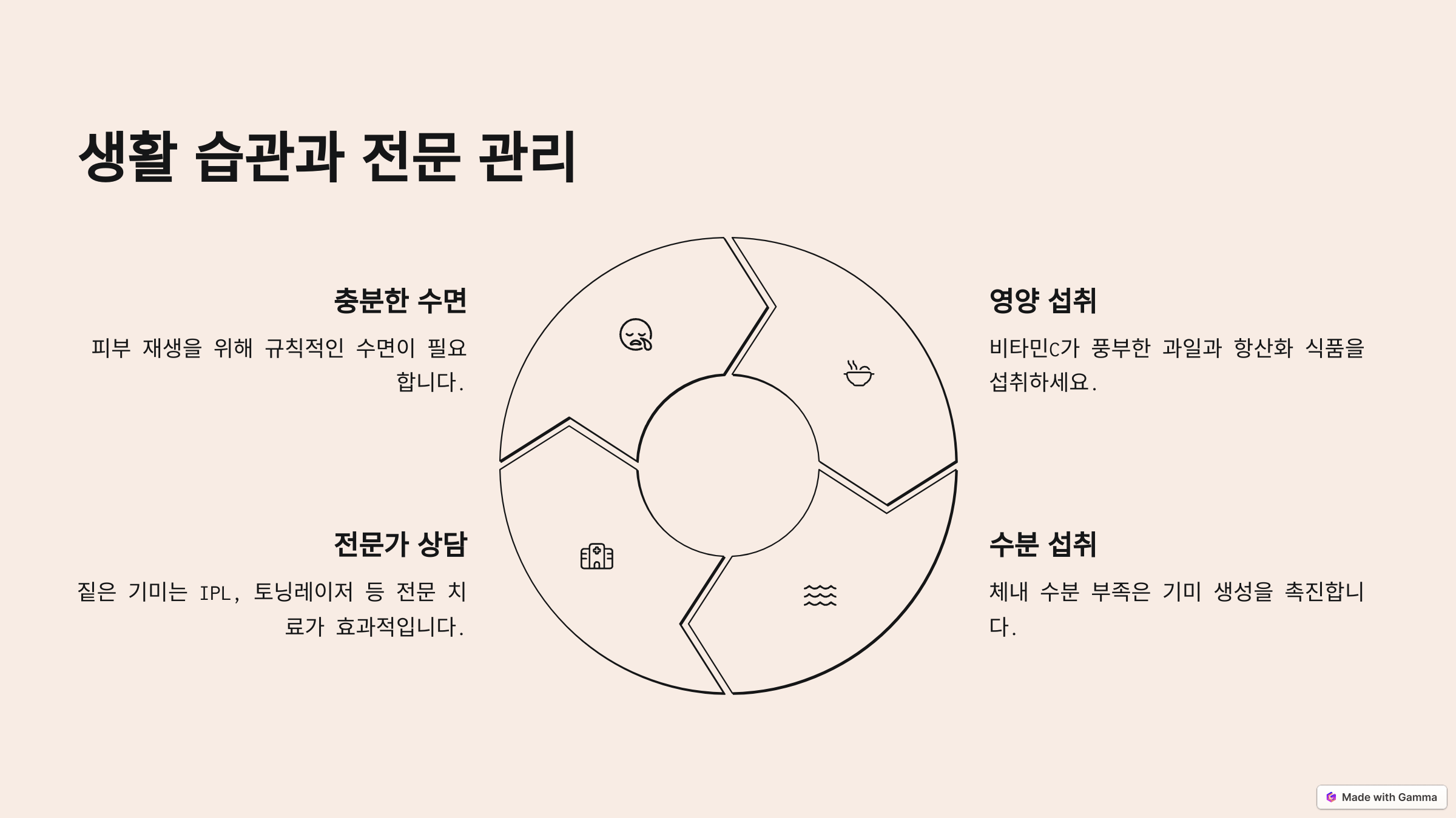 기미는 단순히 외부 환경뿐 아니라, 내부 신체 리듬의 영향도 큽니다. 특히 피로가 누적되거나 수면이 부족하면 피부 재생이 제대로 이루어지지 않아 기미가 더 쉽게 생기도 하고, 짙어질 수 있어요. 봄철에는 활동량이 많아지면서 피로가 쌓이기 쉬우므로, 충분한 수면과 규칙적인 생활 습관이 매우 중요합니다. 또한 기미 개선에 좋은 음식들도 꾸준히 섭취하면 도움이 됩니다. 비타민C가 풍부한 과일(키위, 딸기, 오렌지), 항산화 효과가 있는 토마토, 브로콜리, 녹차 등이 대표적입니다. 수분도 충분히 섭취해 피부가 건조해지지 않도록 관리해 주세요. 체내 수분 부족은 피부 건조와 탄력 저하로 이어져 기미가 더 잘 생기게 만듭니다.