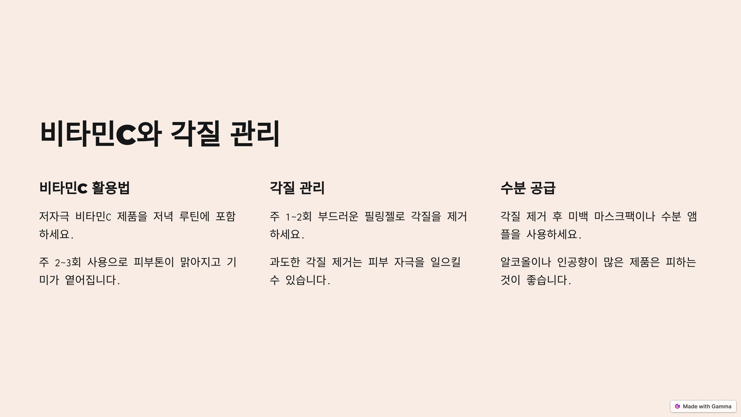 기미가 있는 피부는 각질이 쌓이기 쉬운 편입니다. 묵은 각질이 피부에 쌓이면 미백 성분의 흡수도 방해하고, 피부톤이 칙칙하게 보이면서 기미가 더욱더 두드러져 보일 수 있어요. 하지만 봄철에는 피부가 예민해지기 쉬운 시기이므로, 과도한 각질 제거는 오히려 자극이 될 수 있습니다. 주 1~2회 정도는, 부드러운 필링젤이나 효소 클렌저를 이용해 각질을 제거하도록 합니다., 반드시 충분한 수분 공급으로 피부 밸런스를 맞춰줍니다. 특히 기미를 더 잘 집중 관리하고 싶다면, 각질 제거 후 미백 마스크팩이나 수분 앰플을 사용하는 것도 좋은 방법입니다. 이때 피부에 자극을 줄 수 있는 알코올이나 인공향이 많은 제품은 피하는 것이 좋습니다.