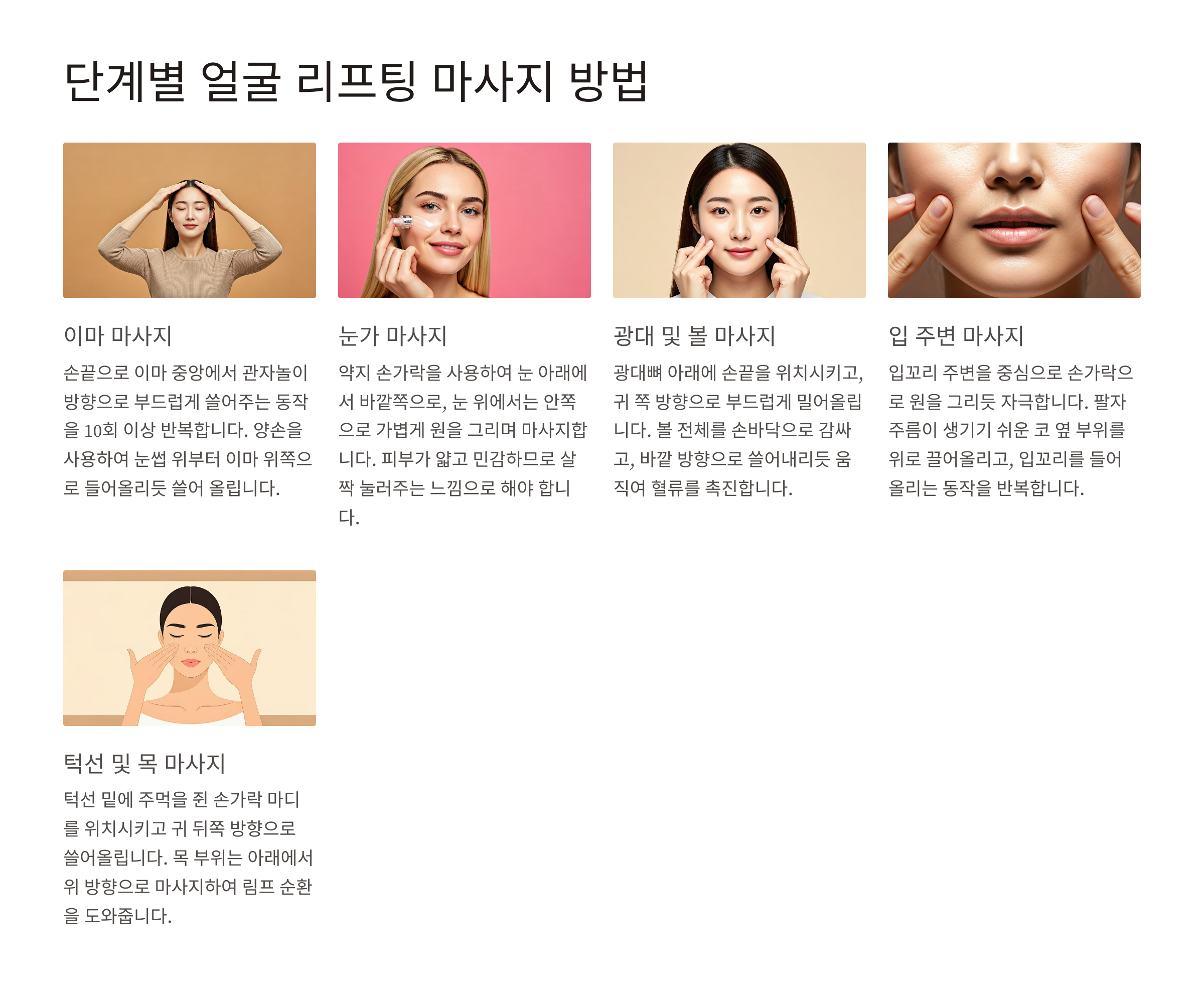 피부는 정직하게 반응합니다. 오늘부터 작은 습관을 실천해보세요. 하루 10분의 리프팅 마사지를 통해 피부뿐 아니라 자신감까지 리프팅되는 기분을 느낄 수 있을 것입니다.