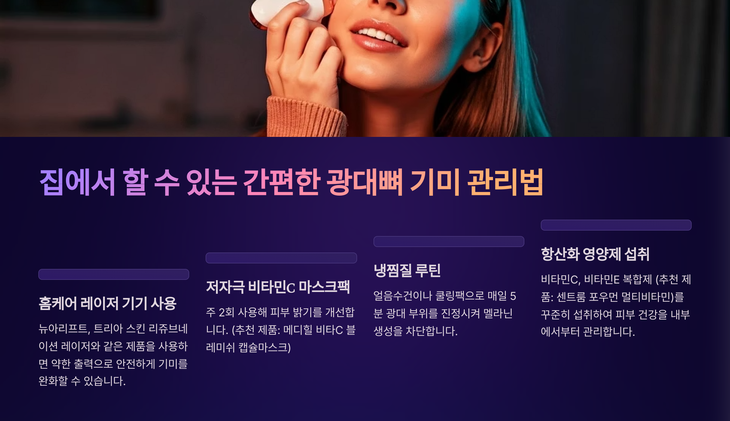 - 얼음수건이나 쿨링팩으로 매일 5분 광대 부위를 진정시켜 멜라닌 생성을 차단