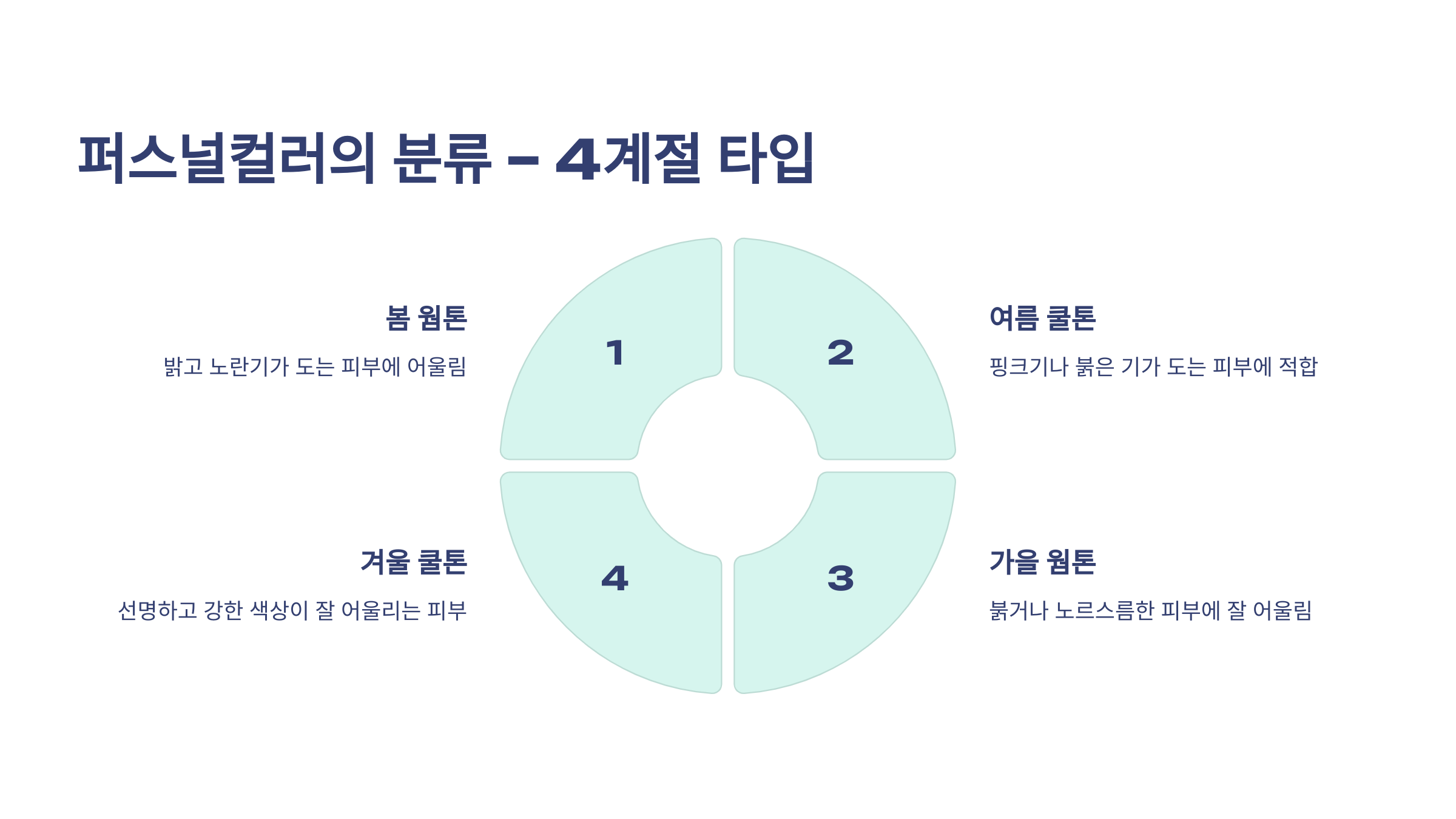 퍼스널컬러는 일반적으로 **4계절 유형(4 season type)**으로 분류됩니다. 이는 색조학(Color Theory)을 바탕으로, 사람의 톤을 따뜻한(Warm) 톤과 차가운(Cool) 톤으로 나누고, 다시 **명도(밝고 어두움), 채도(선명함과 탁함)**에 따라 세분화한 것입니다.