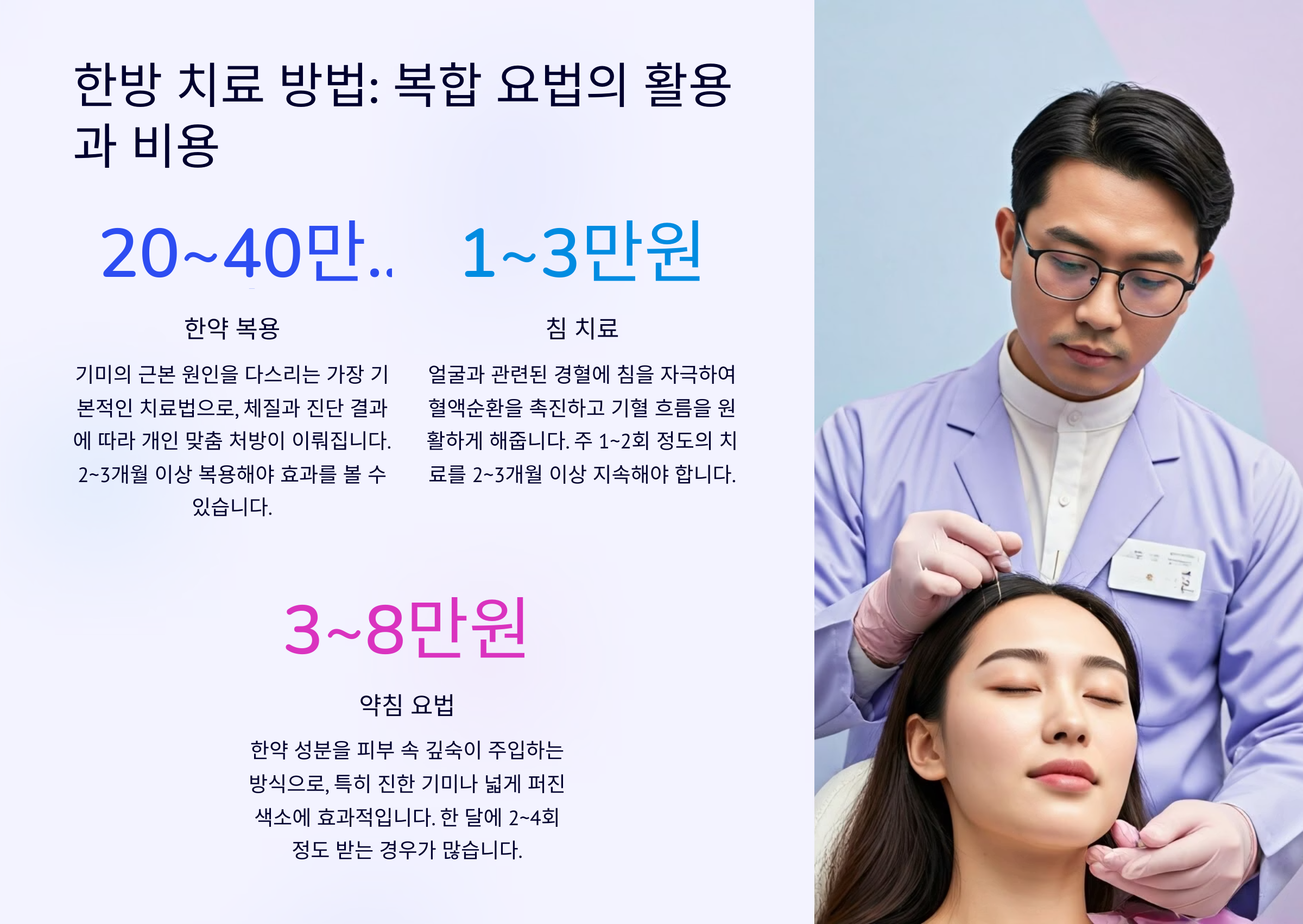 3) 약침 요법 (1회 3~8만 원) 약침은 한약 성분을 피부 속 깊숙이 주입하는 방식으로, 특히 진한 기미나 넓게 퍼진 색소에 효과적입니다. 약침 시술은 얼굴 부위별로 선택적으로 진행되며, 약침의 종류에 따라 가격이 다릅니다. 보통 1회 3만 원에서 8만 원 수준이며, 한 달에 2~4회 정도 받는 경우가 많습니다.