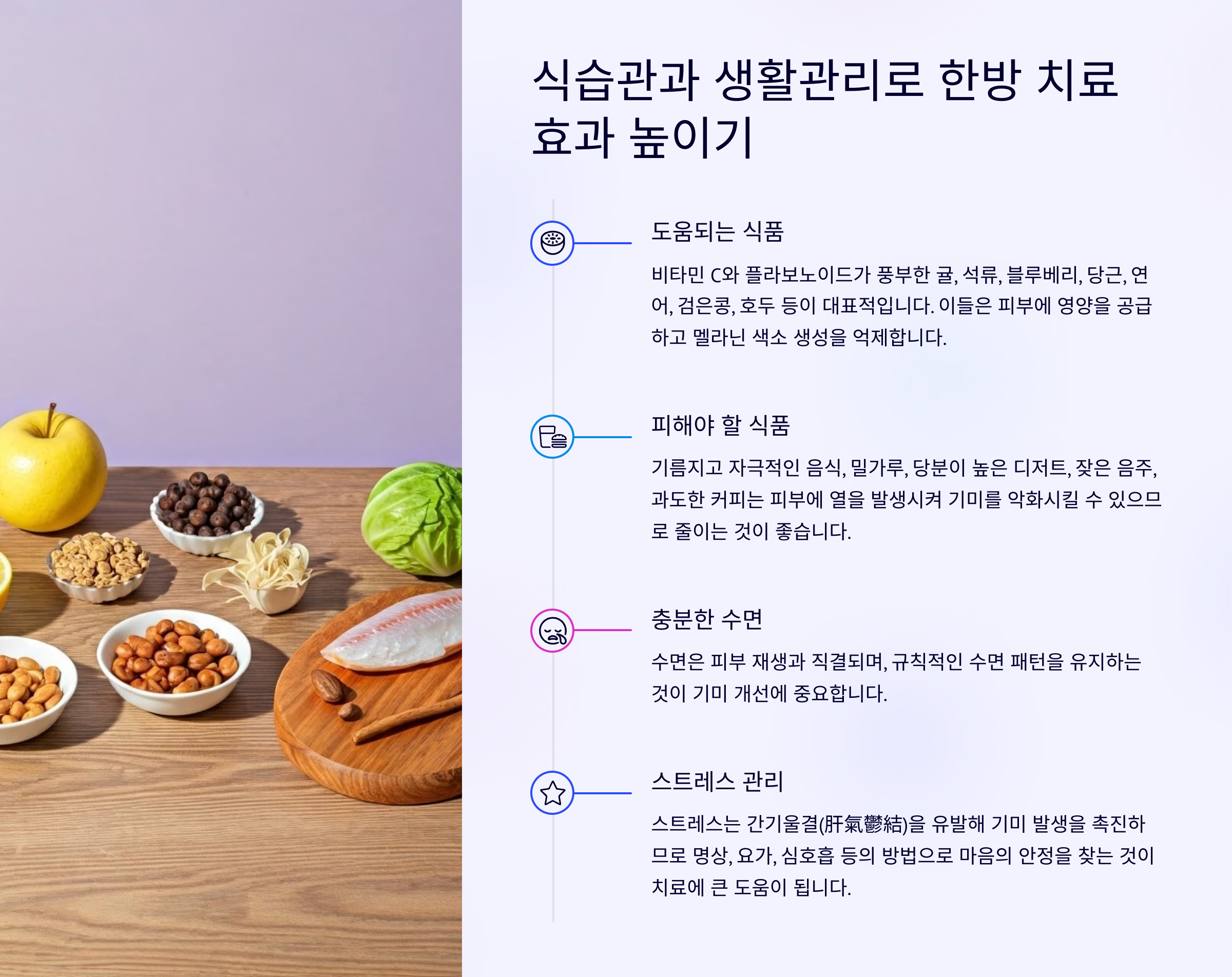 한방 치료의 효과를 극대화하기 위해서는 일상 속 식습관과 생활습관을 함께 관리하는 것이 매우 중요합니다. 한의학에서는 음식도 약이라는 개념으로 접근하며, 기미에 도움이 되는 식재료와 피해야 할 식재료를 명확히 구분합니다.