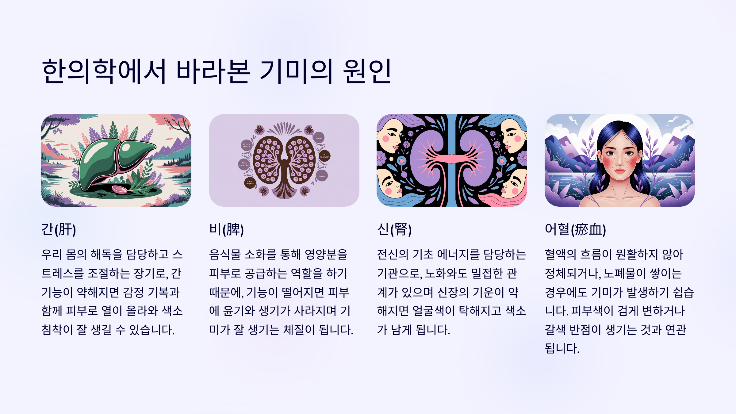 한의학에서는 기미를 단순한 색소침착이 아닌, 오장육부의 기능 저하와 혈액 순환 장애, 기혈 불균형 등 인체 내부의 문제에서 비롯된 피부 이상으로 봅니다. 특히 간(肝), 비(脾), 신(腎)의 기능 저하가 기미와 밀접한 연관이 있다고 여겨집니다.