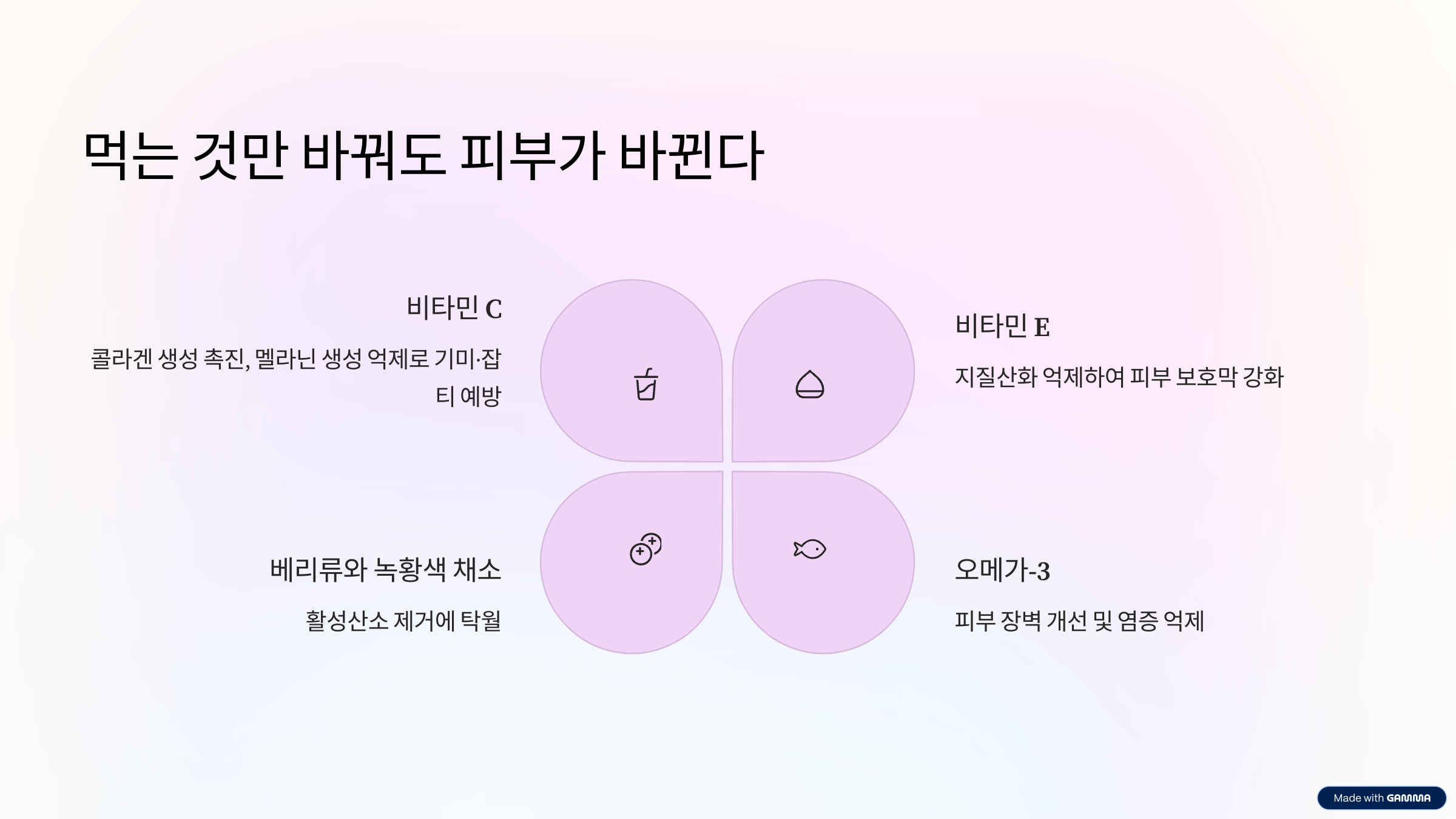 - 비타민 C: 피부 콜라겐 생성을 촉진하고 멜라닌 생성을 억제하여 기미·잡티 예방