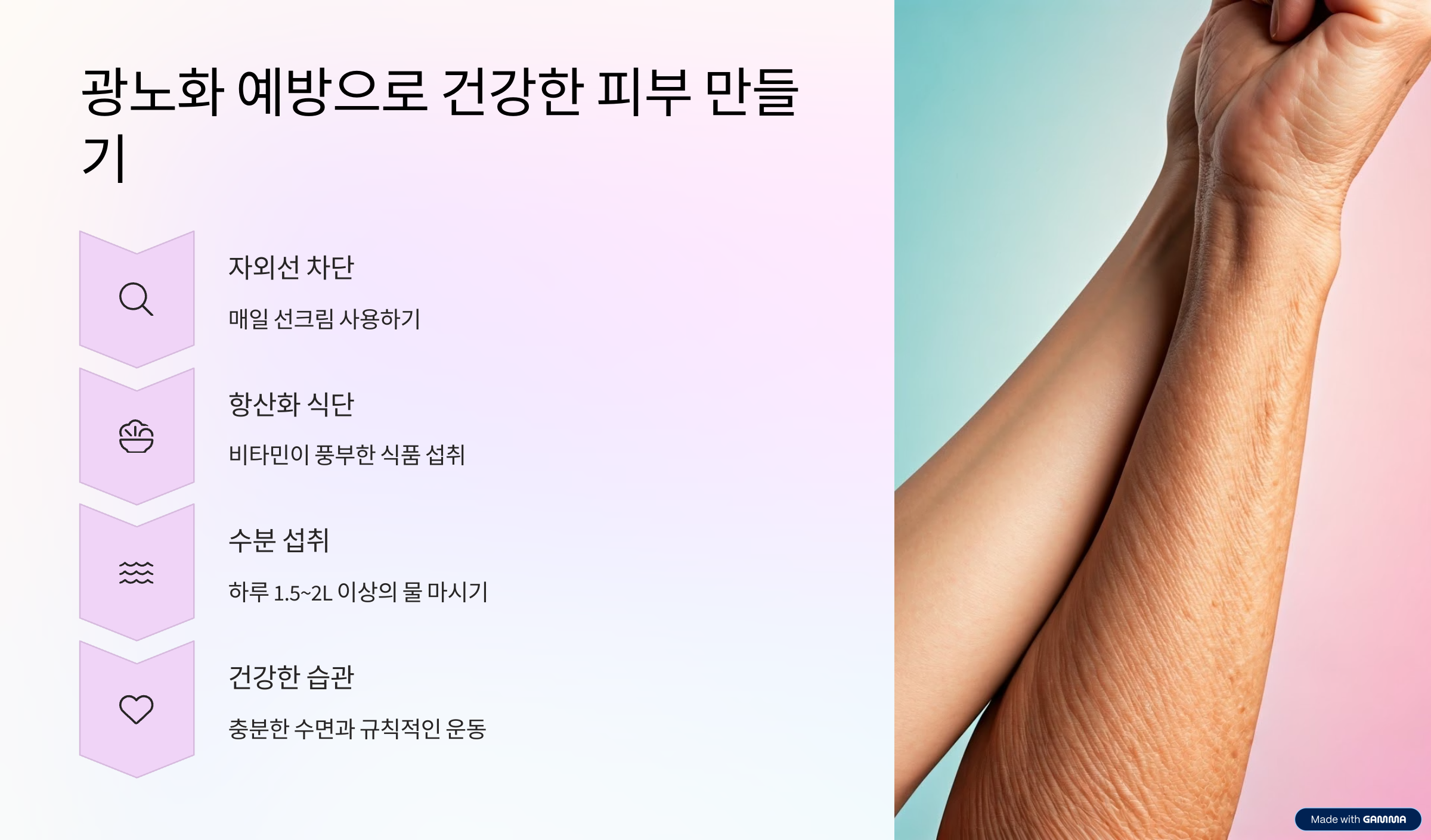 피부는 오늘의 관리가 내일의 상태를 결정합니다. 오늘부터라도 실천하세요. 광노화 예방은 피부에 투자하는 가장 현명한 선택입니다.