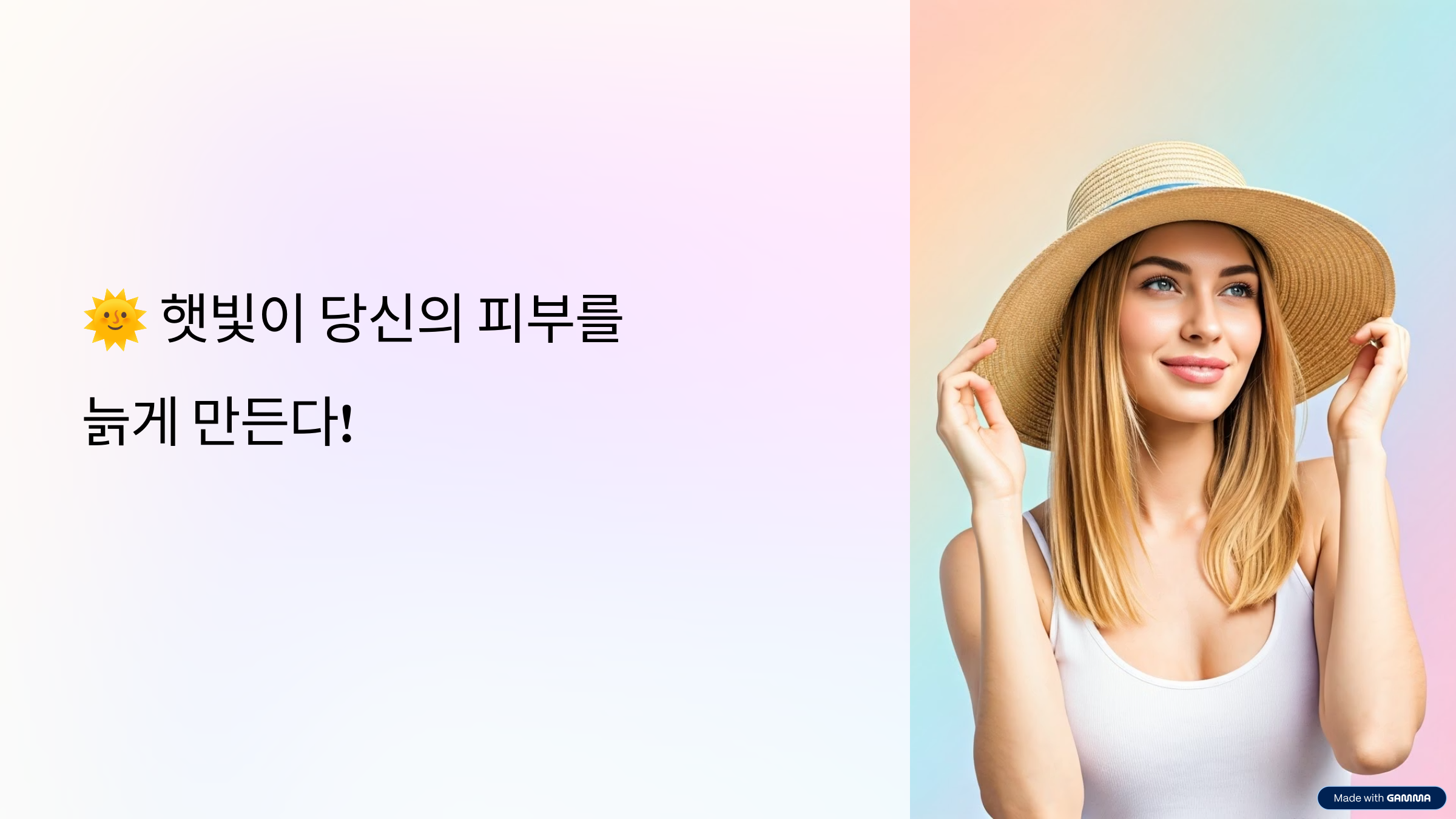 햇빛에 장시간 노출되면 피부 속 콜라겐이 파괴되고, 탄력을 유지하는 엘라스틴 섬유가 손상되며 피부가 점점 얇아지고 건조해집니다. 그 결과 잔주름, 기미, 주근깨, 검버섯, 피부 착색, 피부 거침 등의 증상이 나타납니다. 심지어 장기적으로는 피부암의 위험성도 높아집니다.