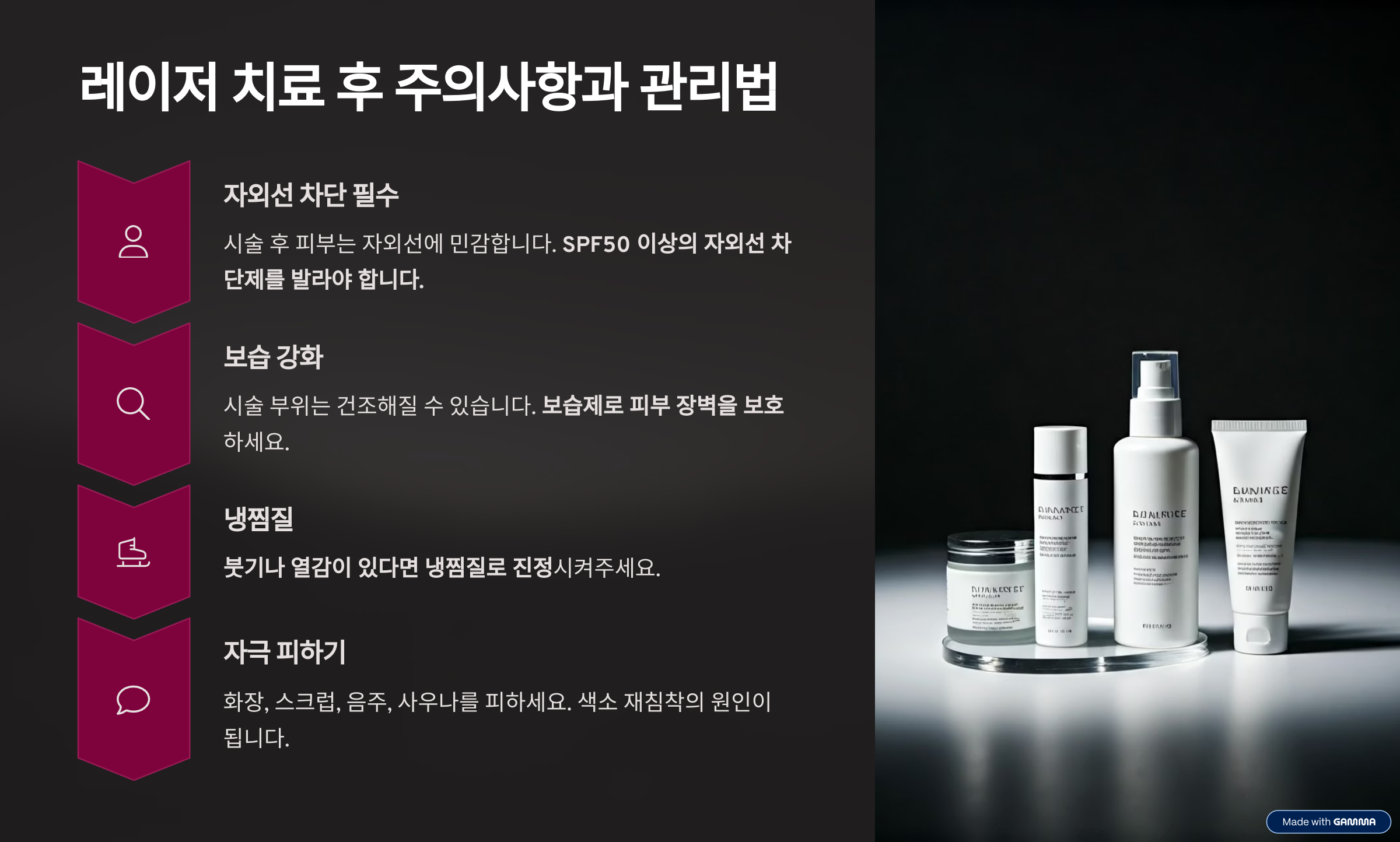 레이저 시술 후에는 피부가 예민하고 민감한 상태가 되기 때문에 사후 관리가 무엇보다 중요합니다. 잘못된 사후 관리로 인해 색소가 재발하거나 오히려 악화되는 경우도 있으므로 주의가 필요합니다.
