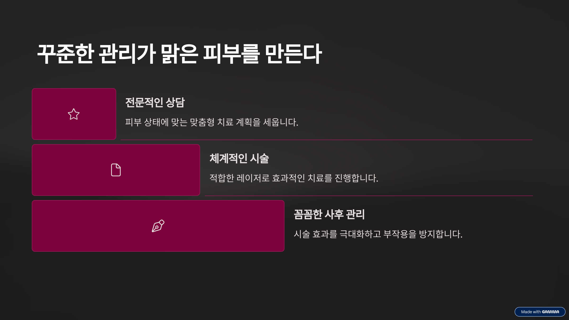 레이저 시술은 단기적인 변화보다 장기적인 피부 건강을 목표로 하는 지속적인 관리가 핵심입니다.