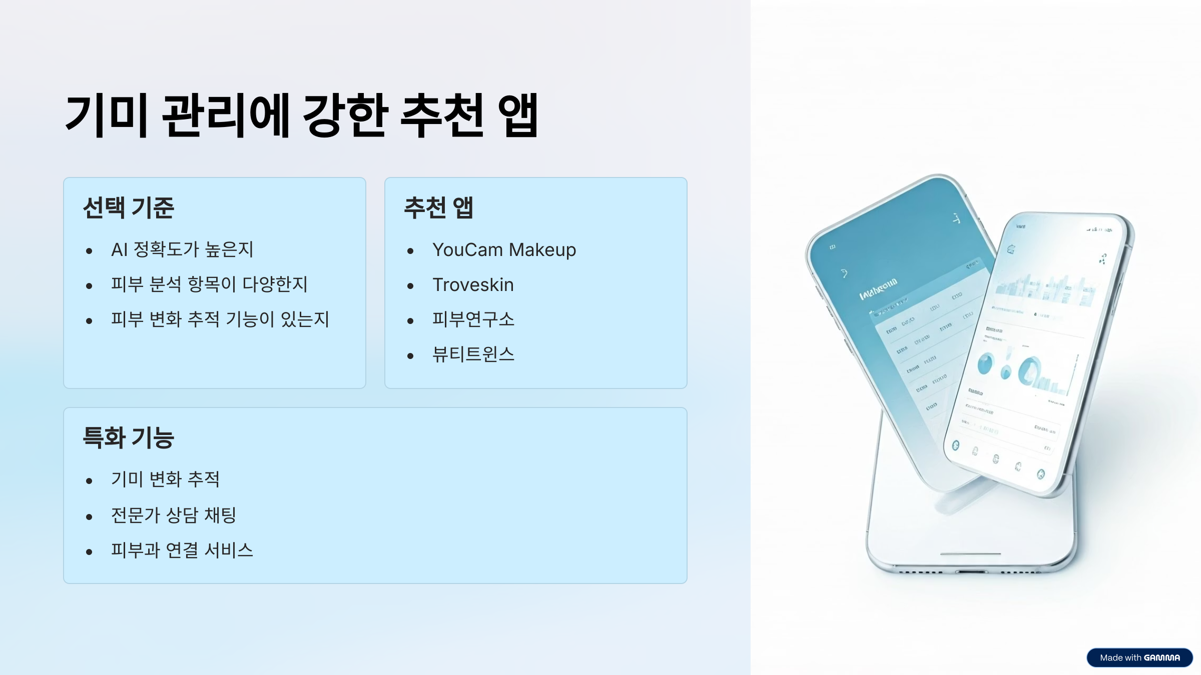 기미 관리를 위해 피부 진단 앱을 찾는다면, 몇 가지 기준을 고려하는 것이 좋습니다. 첫째, AI 정확도가 높은지, 둘째, 피부 분석 항목이 다양하고 구체적인지, 셋째, 피부 변화 추적 기능이 있는지를 확인해야 합니다. 대표적으로는 ‘YouCam Makeup’, ‘Troveskin’, ‘피부연구소’, ‘뷰티트윈스’ 등의 앱이 기미 분석에 특화되어 있다고 평가받고 있습니다.