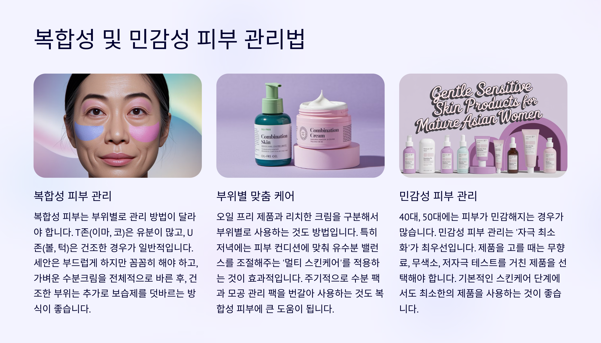 복합성 피부는 부위별로 관리 방법이 달라야 합니다. T존(이마, 코)은 유분이 많고, U존(볼, 턱)은 건조한 경우가 일반적입니다. 40대, 50대 복합성 피부는 더욱 까다로운 관리가 필요합니다. 세안은 부드럽게 하지만 꼼꼼히 해야 하고, 가벼운 수분크림을 전체적으로 바른 후, 건조한 부위는 추가로 보습제를 덧바르는 방식이 좋습니다. 오일 프리 제품과 리치한 크림을 구분해서 부위별로 사용하는 것도 방법입니다. 특히 저녁에는 피부 컨디션에 맞춰 유수분 밸런스를 조절해 주는 ‘멀티 스킨케어’를 적용하는 것이 효과적입니다. 필요한 경우, 피지 분비가 많은 부위에는 수분 앰플만 바르고, 건조한 부위에는 영양 크림을 추가하는 식으로 유연하게 조절해야 합니다. 또한, 주기적으로 수분 팩과 모공 관리 팩을 번갈아 사용하는 것도 복합성 피부에 큰 도움이 됩니다.